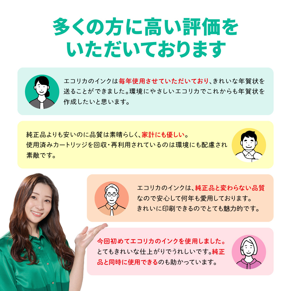 エコリカリサイクルインクカートリッジは使用済みインクカートリッジを全国に設置している「エコリカ回収BOX」で回収しリユース(再使用)製品として再生した環境にやさしい製品です。
