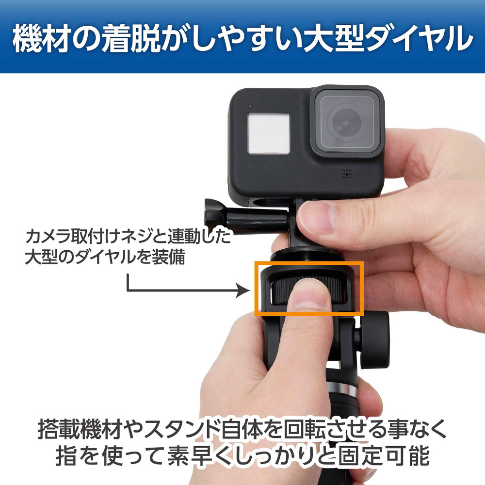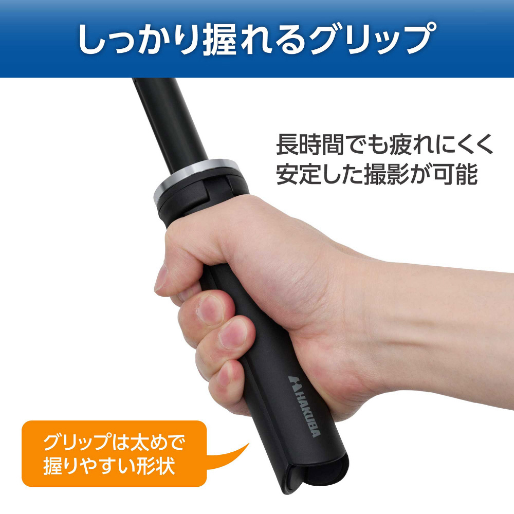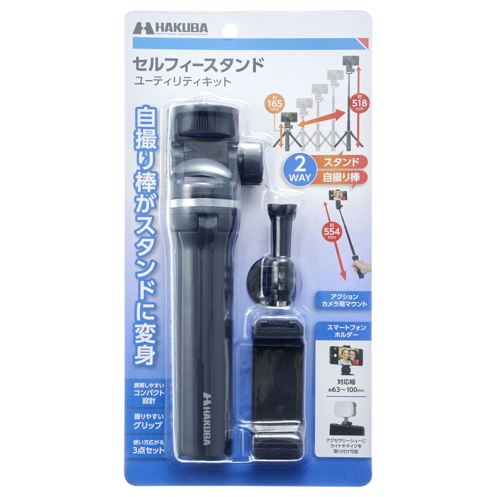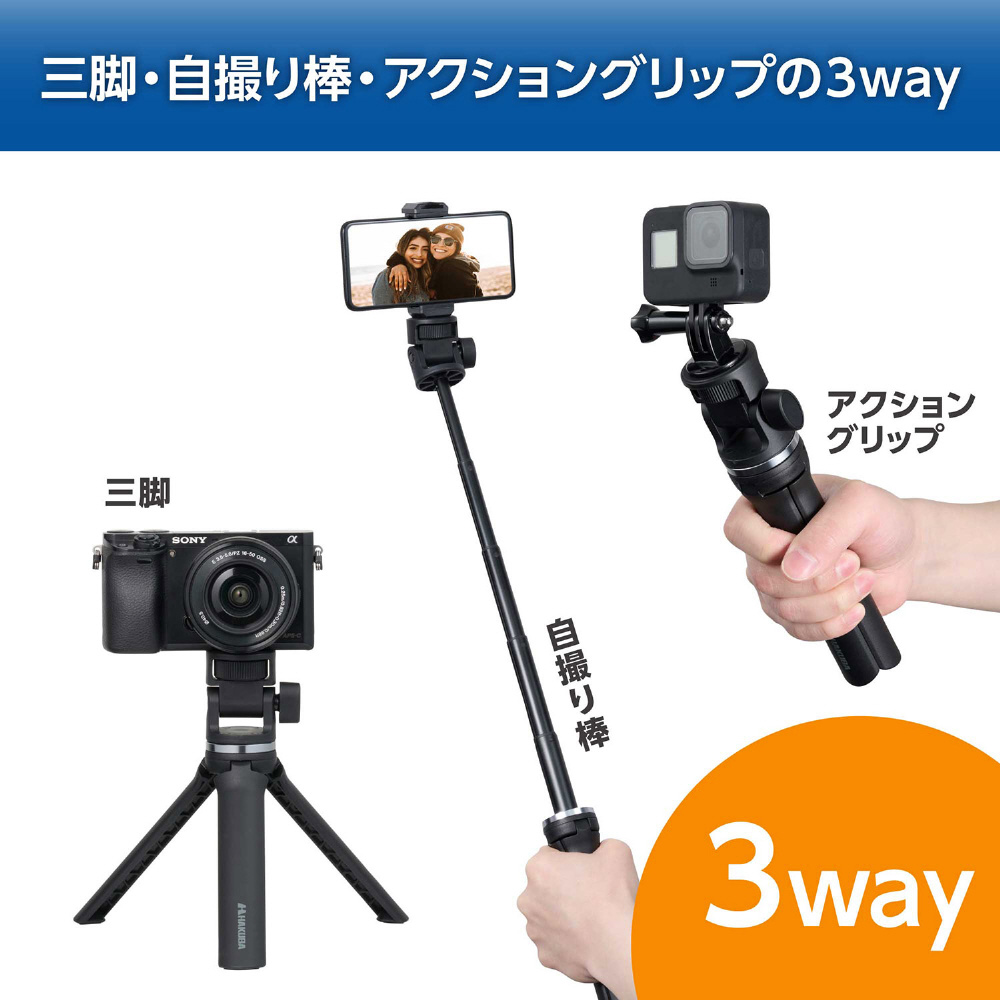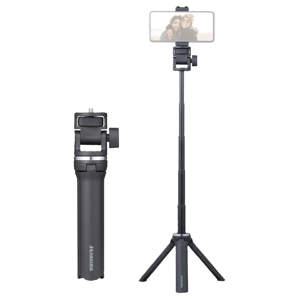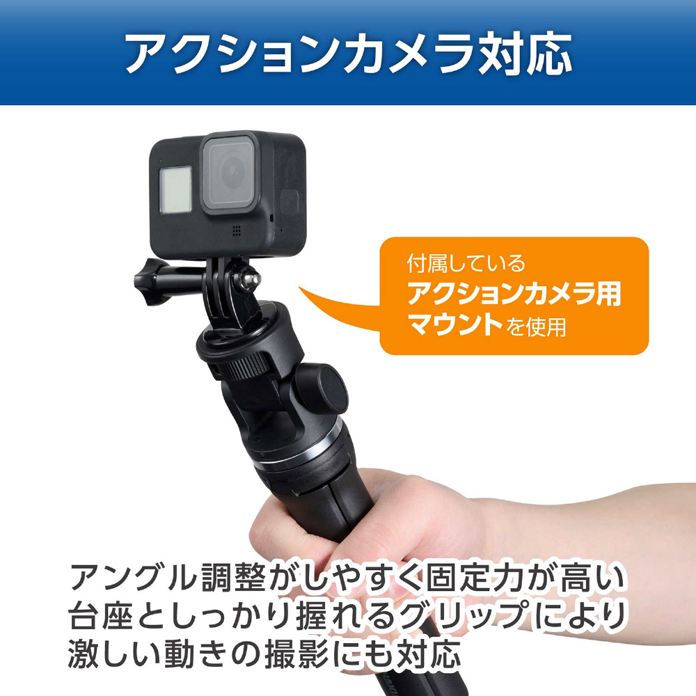 脚をたたんで自撮り棒やグリップとしても使え、アクセサリーシューを備えたスマートフォンホルダーと、アクションカメラ用マウントが付属しています。