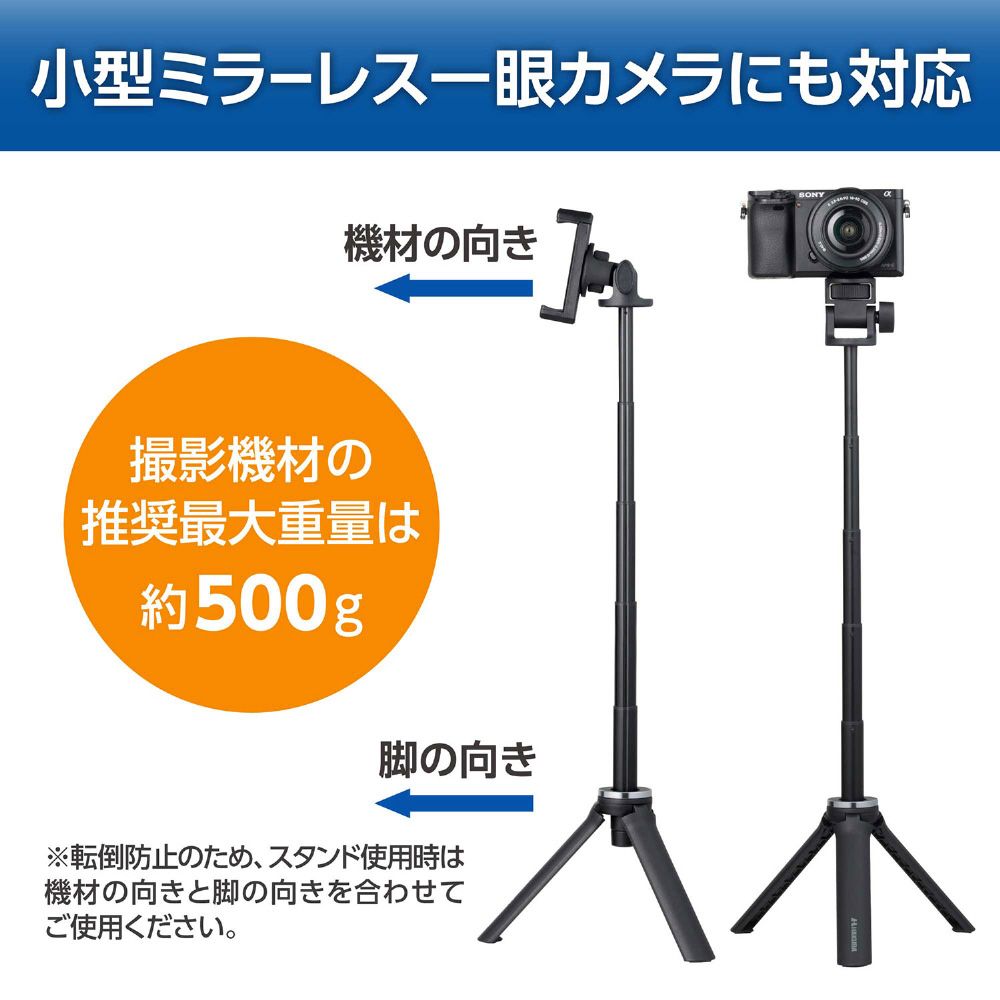 動画撮影やライブ配信に!スマートフォンから小型ミラーレス一眼カメラまで対応。自撮り棒にもなるマルチ撮影スタンド