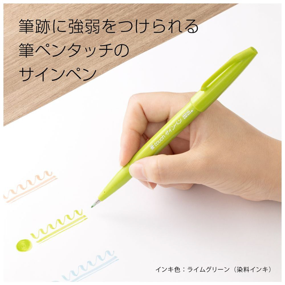2023年新色発売。ロングセラーのぺんてるサインペンに、筆のタッチ感をプラス。書き味はまさに筆ペンとサインペンの中間。いつもの手書きを一段おしゃれにしてくれます。
