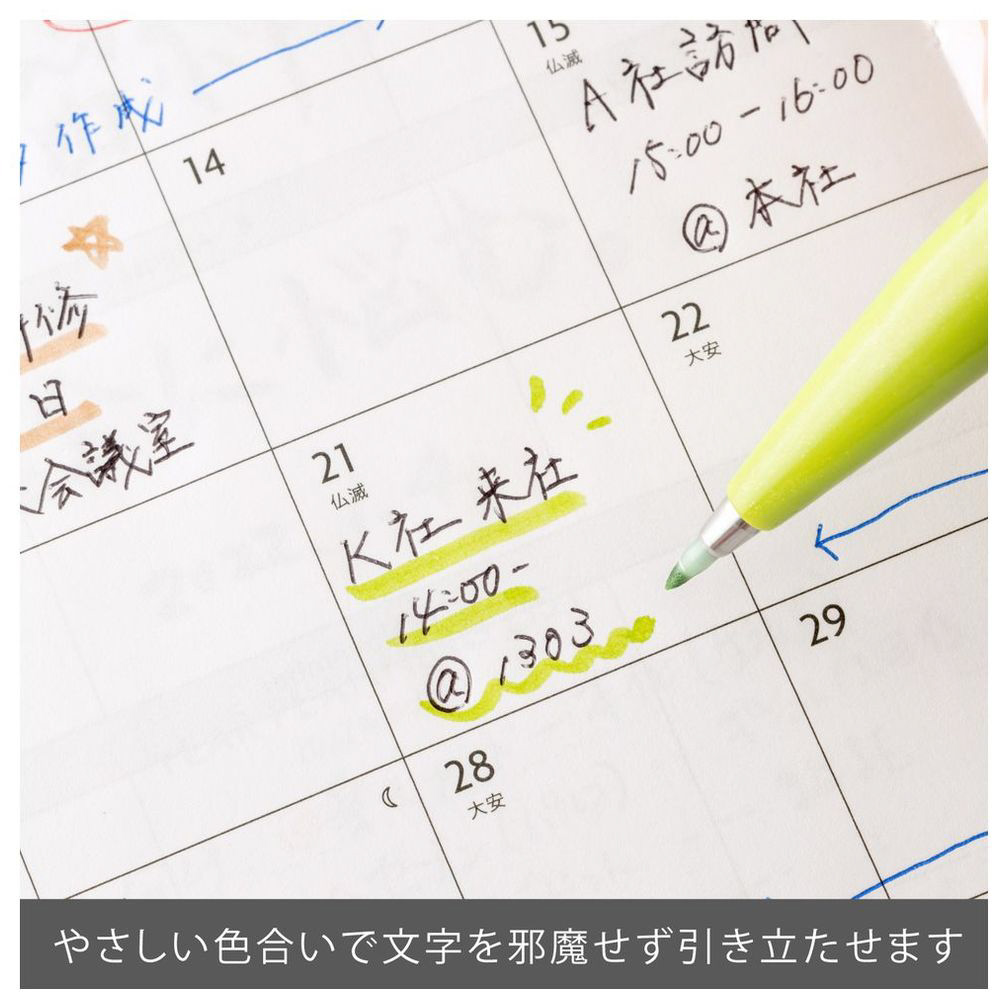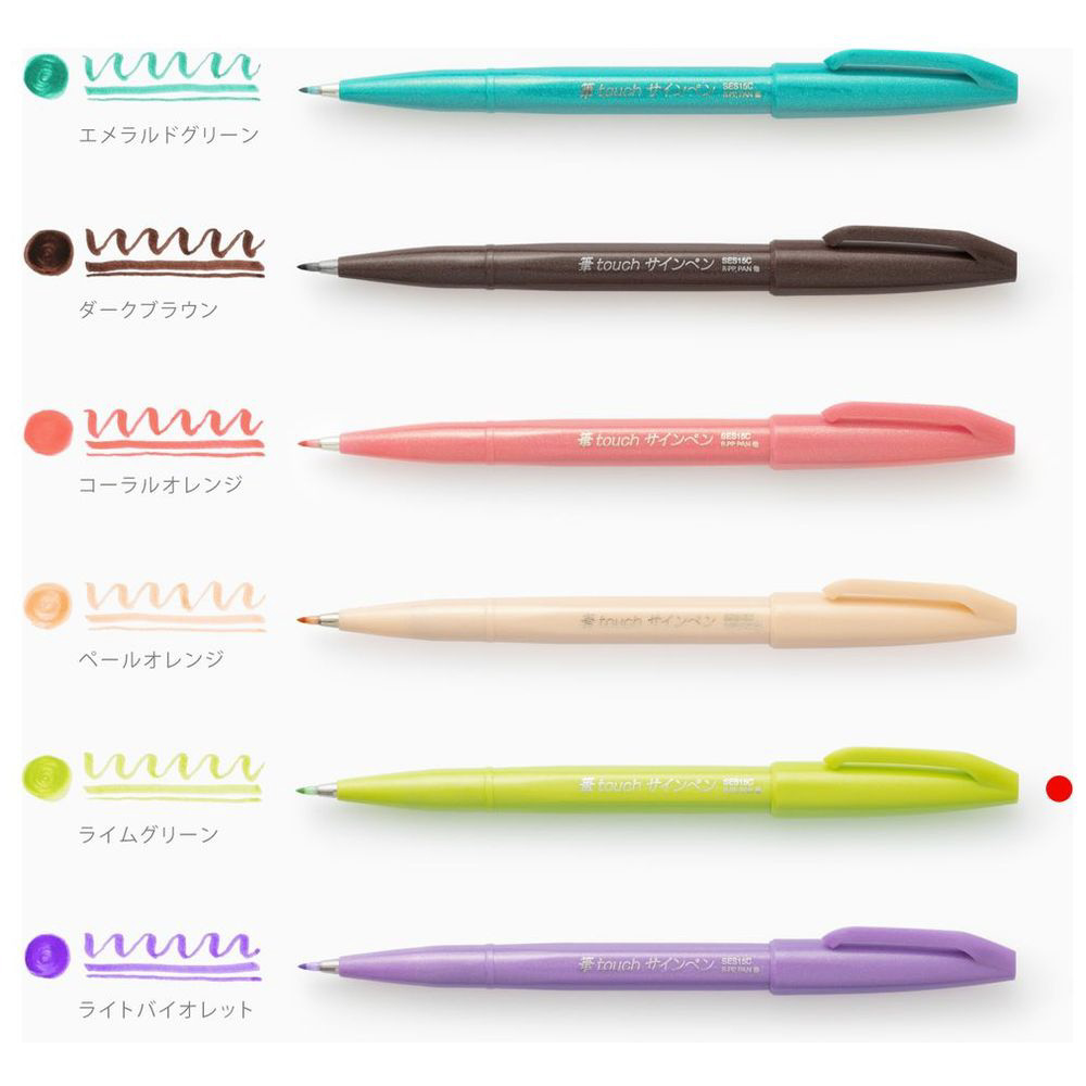 「筆タッチサインペン」には、文字にも装飾にも使いやすい、エメラルドグリーン、ダークブラウン、コーラルオレンジ、