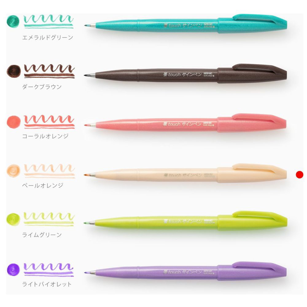 「筆タッチサインペン」には、文字にも装飾にも使いやすい、エメラルドグリーン、ダークブラウン、コーラルオレンジ、