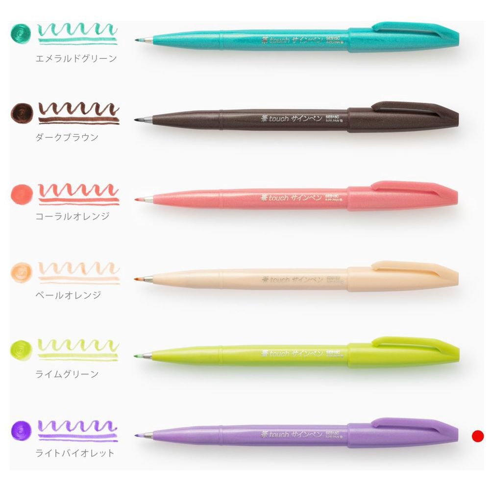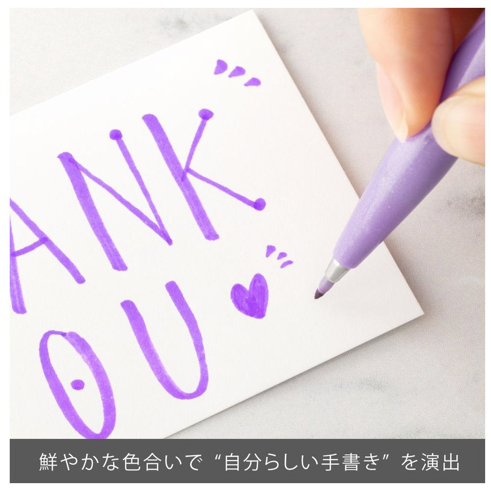 2023年新色発売。ロングセラーのぺんてるサインペンに、筆のタッチ感をプラス。書き味はまさに筆ペンとサインペンの中間。いつもの手書きを一段おしゃれにしてくれます。