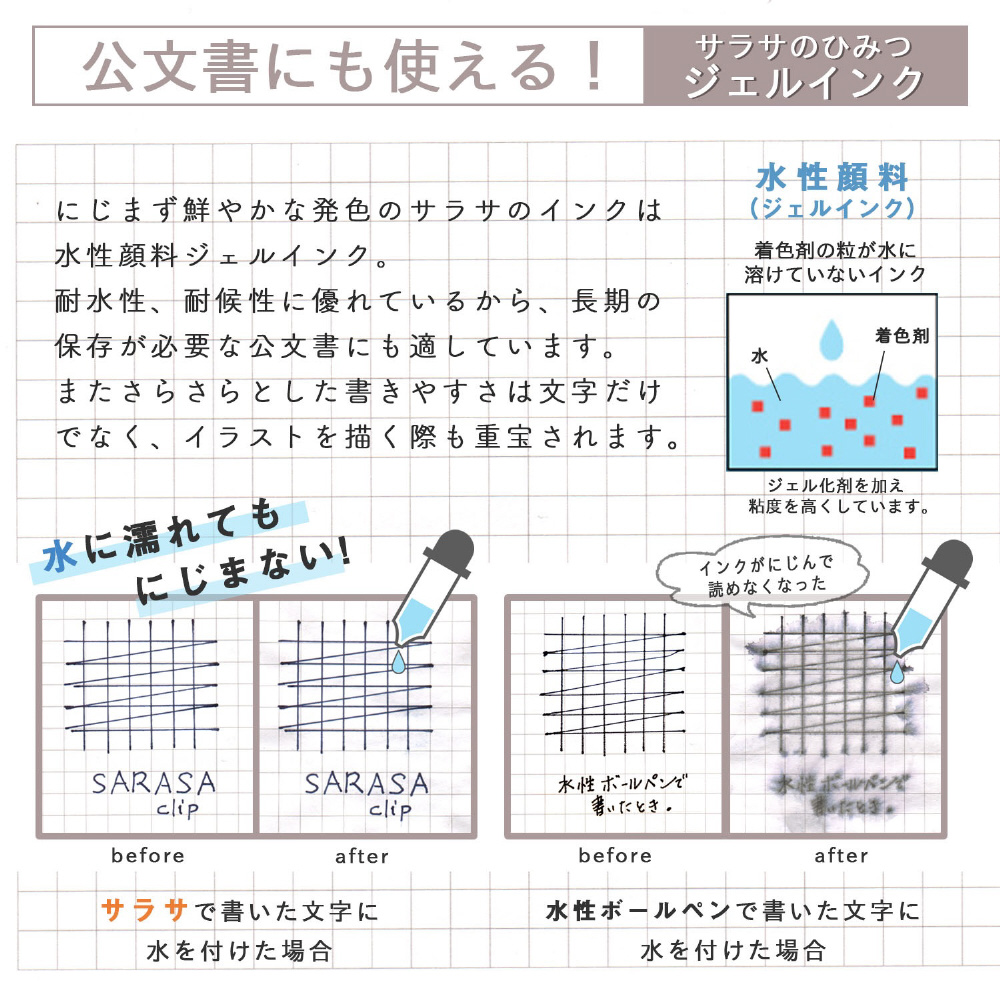 ジェルインクなので、さらさらとしたなめらかな書き味です。耐水性に優れた水性顔料だから、濃くてにじまず、鮮やかな発色と豊富な色が楽しめます。