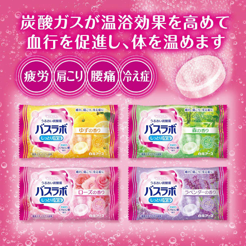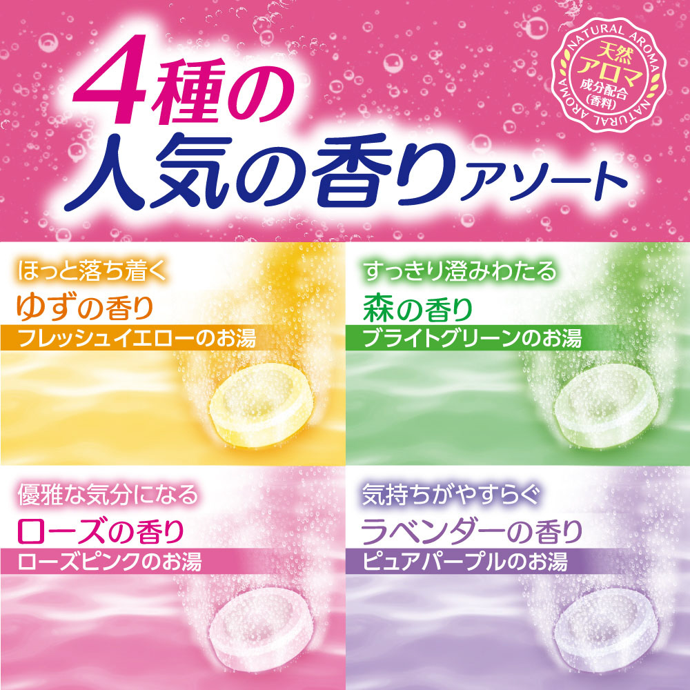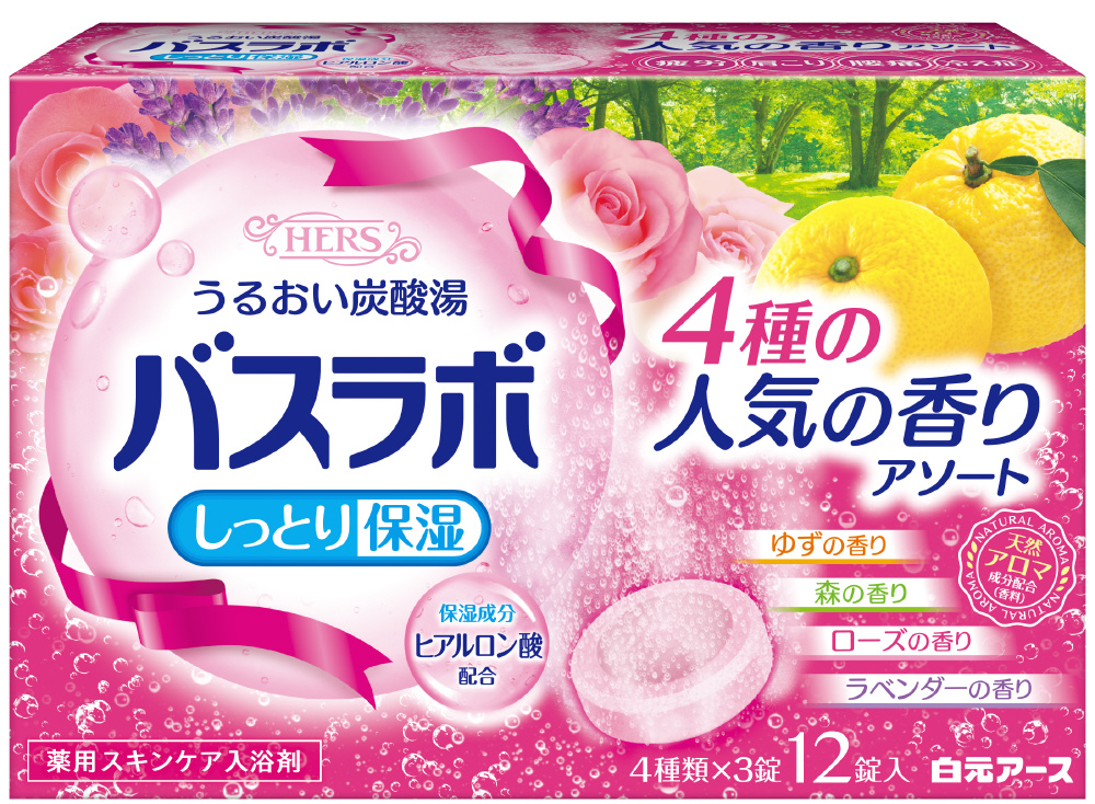 スキンケアタイプの炭酸ガスの薬用入浴剤。なめらかな泡が湯面にただよい、すべすべな肌ざわりに。ヒアルロン酸(保湿成分)配合。4種の人気の香りが楽しめます。『医薬部外品』