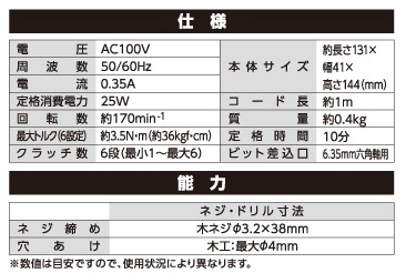 【仕様】●電圧:AC100V ●周波数:50/60Hz ●電流:0.35A ●定格消費電力:25W ●回転数:約170min-1 ●最大トルク(6設定):約3.5N.m(約36kgf.cm) ●ビット差込口:6.35mm六角軸用 ●クラッチ数:6段(最小1〜最大6) ●本体サイズ:約長さ131×幅41×高さ144(mm) ●コード長:約1m ●質量:約0.4kg ●定格時間:10分 【能力】●ネジ締め:木ネジφ3.2×38mm ●穴あけ:木工 最大φ4mm