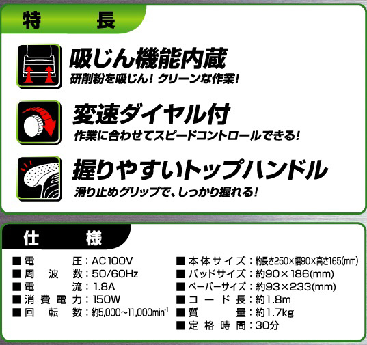 【仕様】●電圧:AC100V ●周波数:50/60Hz ●電流:1.8A ●消費電力:150W ●回転数:約5,000〜11,000 min-1 ●本体サイズ約長さ250×幅90×高さ165(mm) ●パッドサイズ:約90×186(mm) ●ペーパーサイズ:約93×233(mm) ●コード長:約1.8m ●質量:約1.7kg ●定格時間:30分