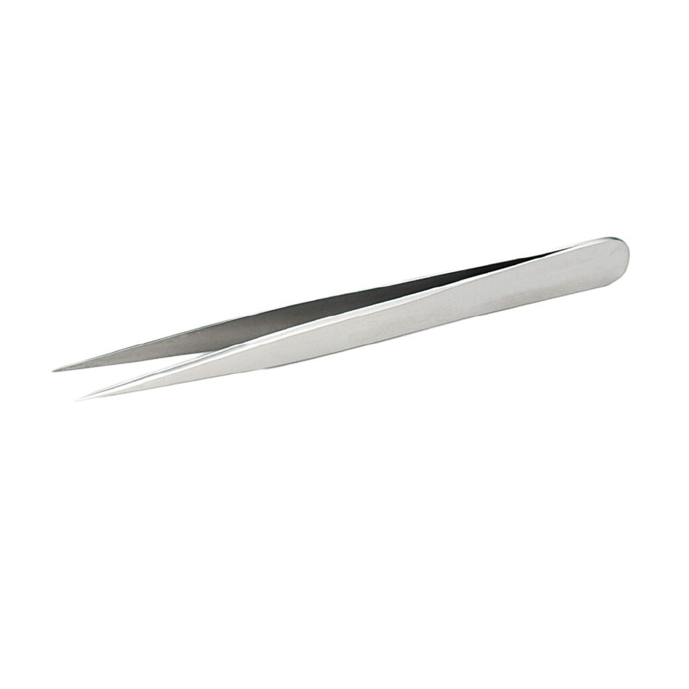 先端が鋭く、細かな部品の保持に向いた精密ピンセット。