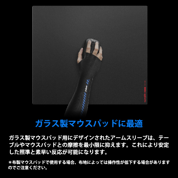 ガラス製マウスパッド用にデザインされたアームスリーブは腕とテーブルやマウスパッドとの摩擦を最小限に抑えます。これにより、安定した照準と素早い反応が可能になります。