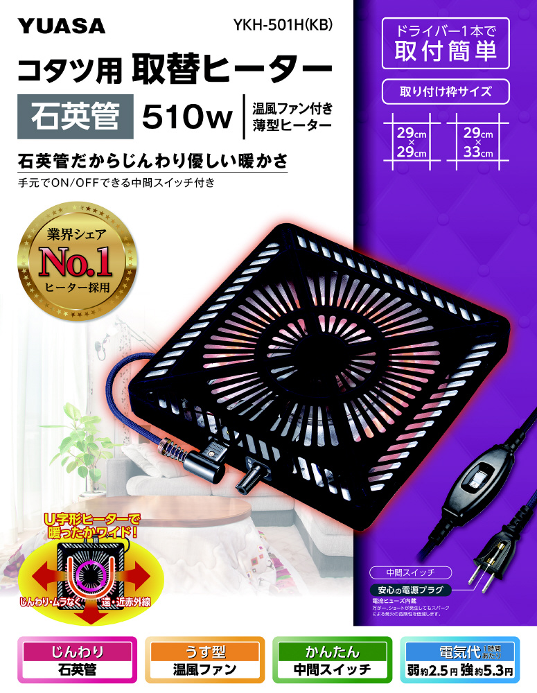 こたつ用取替えヒーター。ドライバー1本で簡単取付け。遠赤外線放射に優れた石英管ヒーター。2つのヒューズ内蔵で2重の安全構造。
