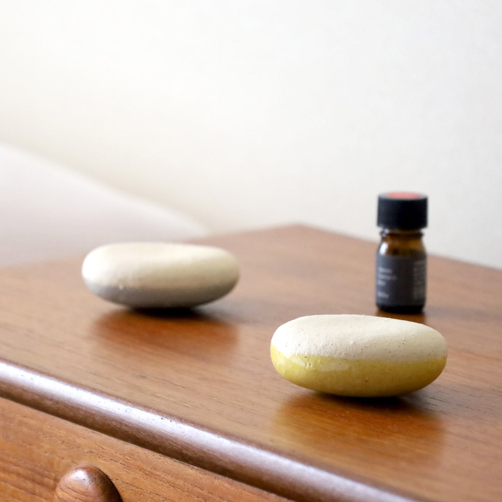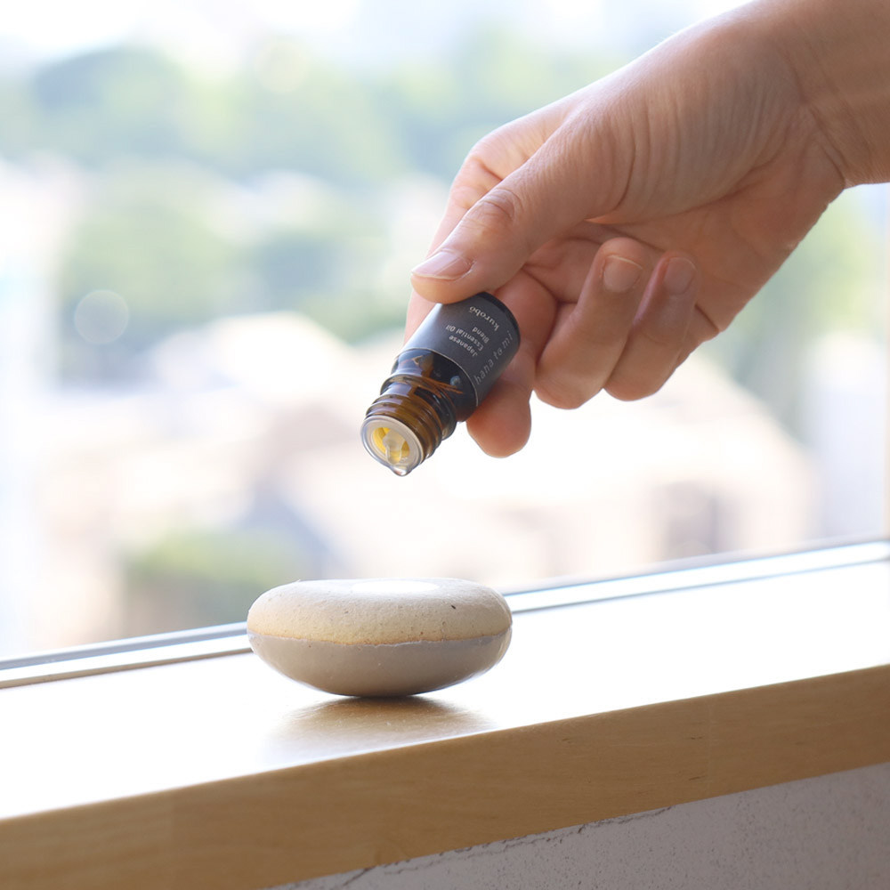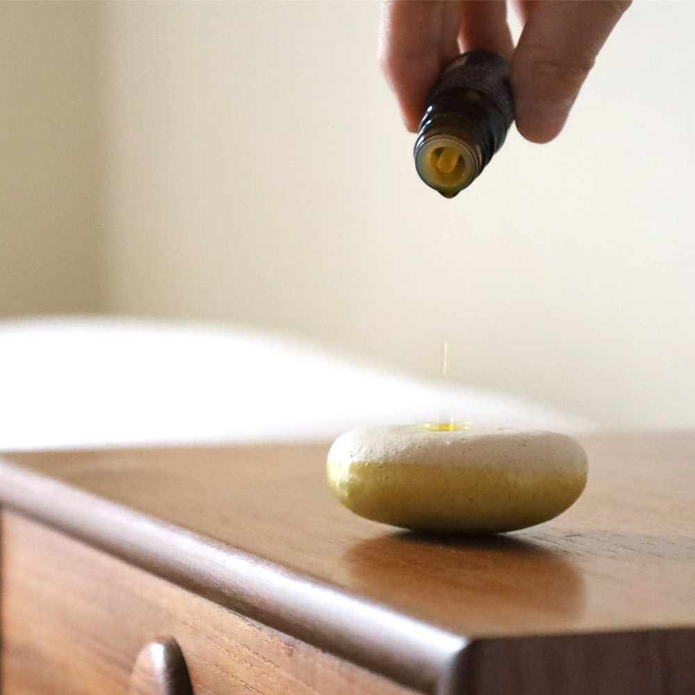 アロマストーンを平らな場所に設置し、くぼみのある面にお好みの精油を3~5滴落として香りをお楽しみください。