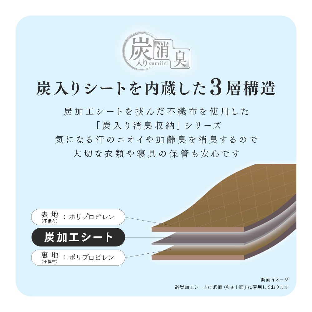炭加工シートを挟んだ不織布を使用した「炭入り消臭収納」シリーズ。気になる汗のニオイや加齢臭を消臭するので、大切な衣類や寝具の保管も安心です。