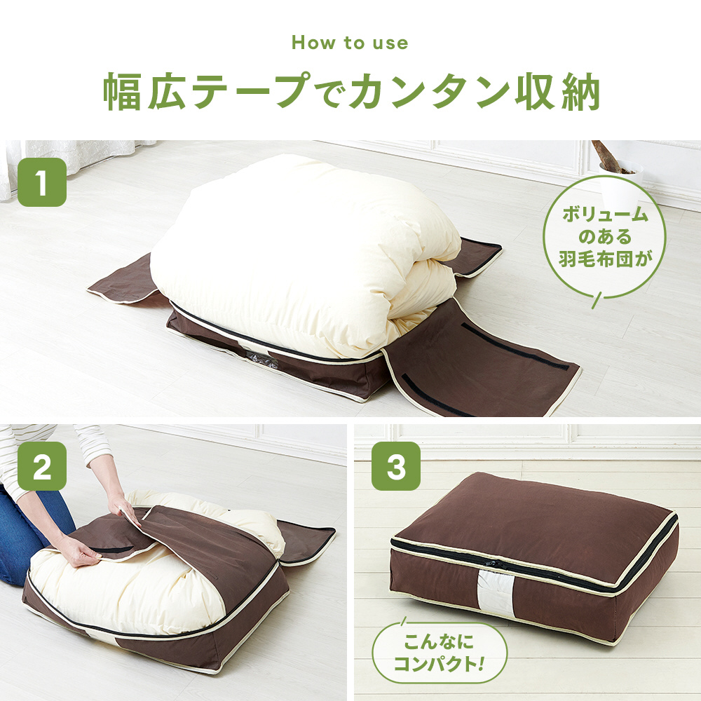 かさばる羽毛布団も、手間をかけずコンパクトに収納。シーズンオフの布団や普段使わない来客用の布団にも。