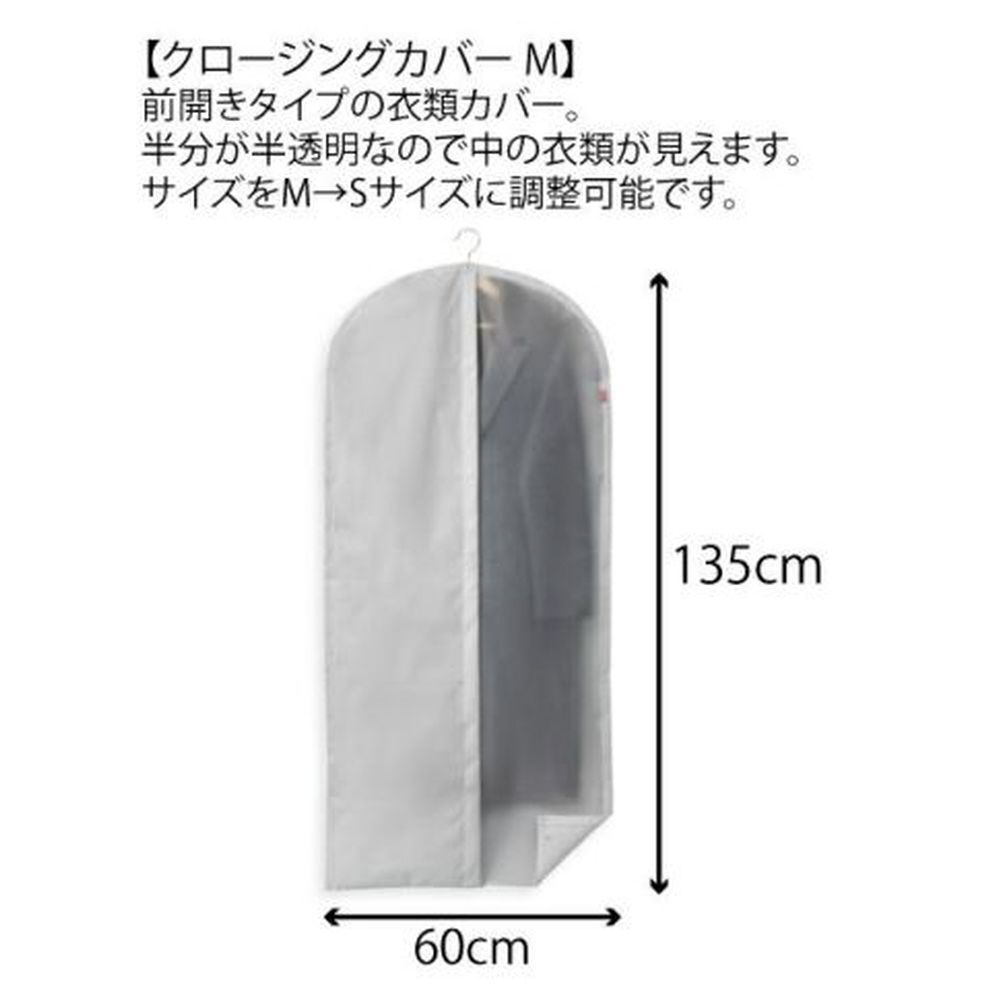 半分が半透明なので中の衣類が見える衣類カバーです。サイズをM→Sサイズに調整可能です。マチ付きで、衣服を入れやすい。通気性がよく、衣類を守ります。
