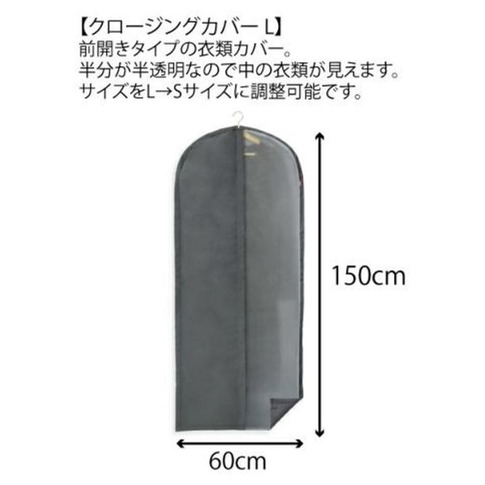 半分が半透明なので中の衣類が見える衣類カバーです。サイズをL→Sサイズに調整可能です。マチ付きで、衣服を入れやすい。通気性がよく、衣類を守ります。