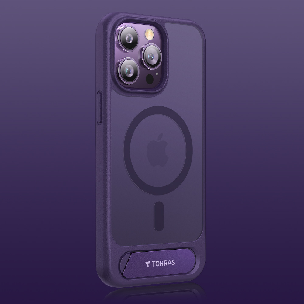 TORRAS UPRO Pstand Caseは特許取得のデザインで、折りたたみ式スタンドが横向きと縦向きに使用でき、強力な磁力でMagSafeアクセサリーをしっかりサポート。