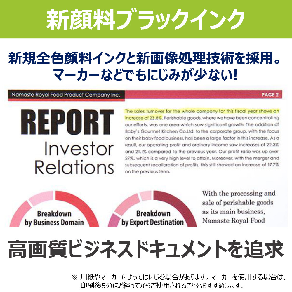 新顔料インクと新画像処理技術により、文字のにじみを低減することで高画質ビジネスドキュメントを提供します。