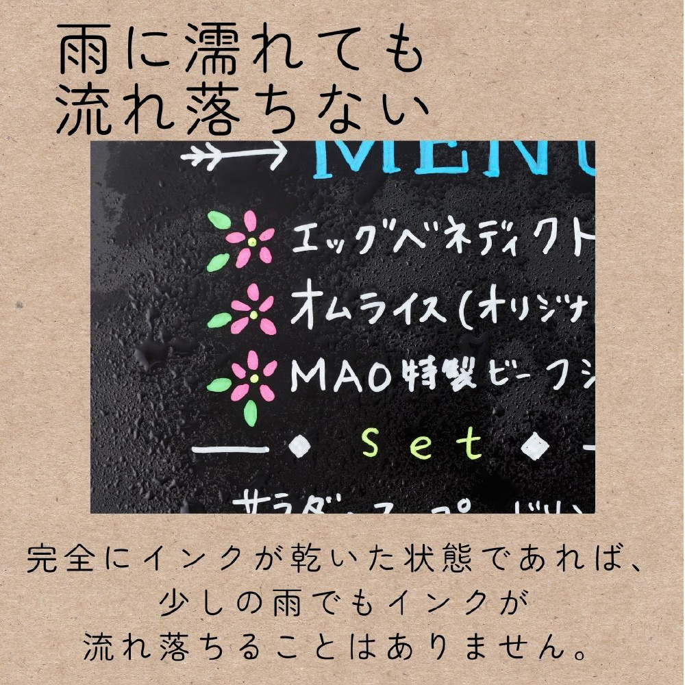 あざやかな発色、簡単に消せる水拭きタイプ、雨に濡れても流れ落ちない。