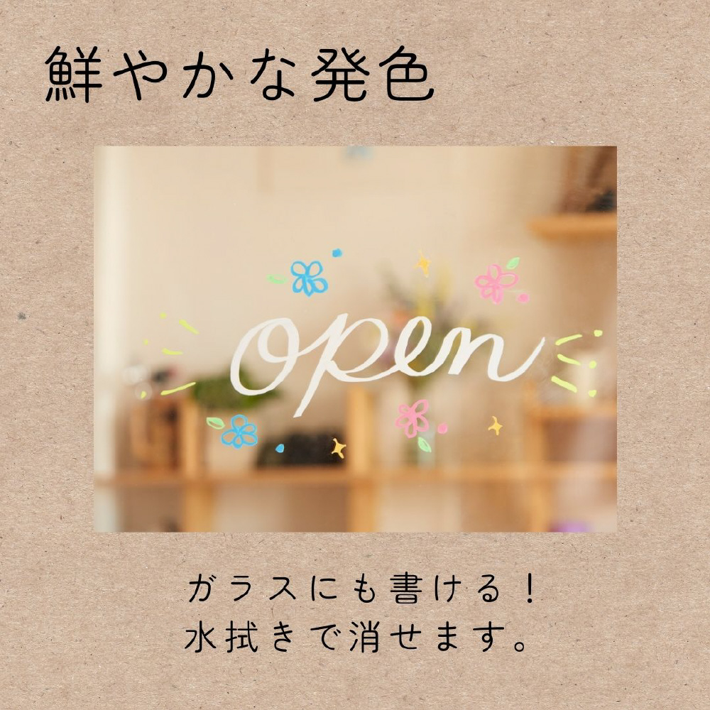 あざやかな発色、簡単に消せる水拭きタイプ、雨に濡れても流れ落ちない。