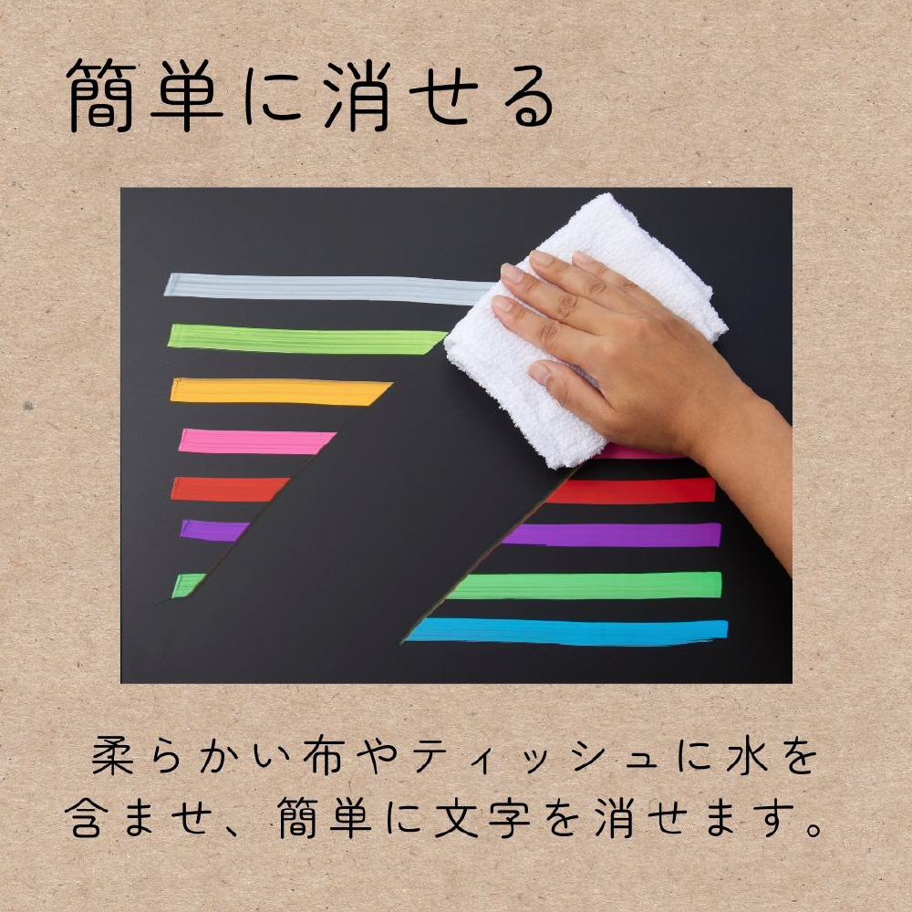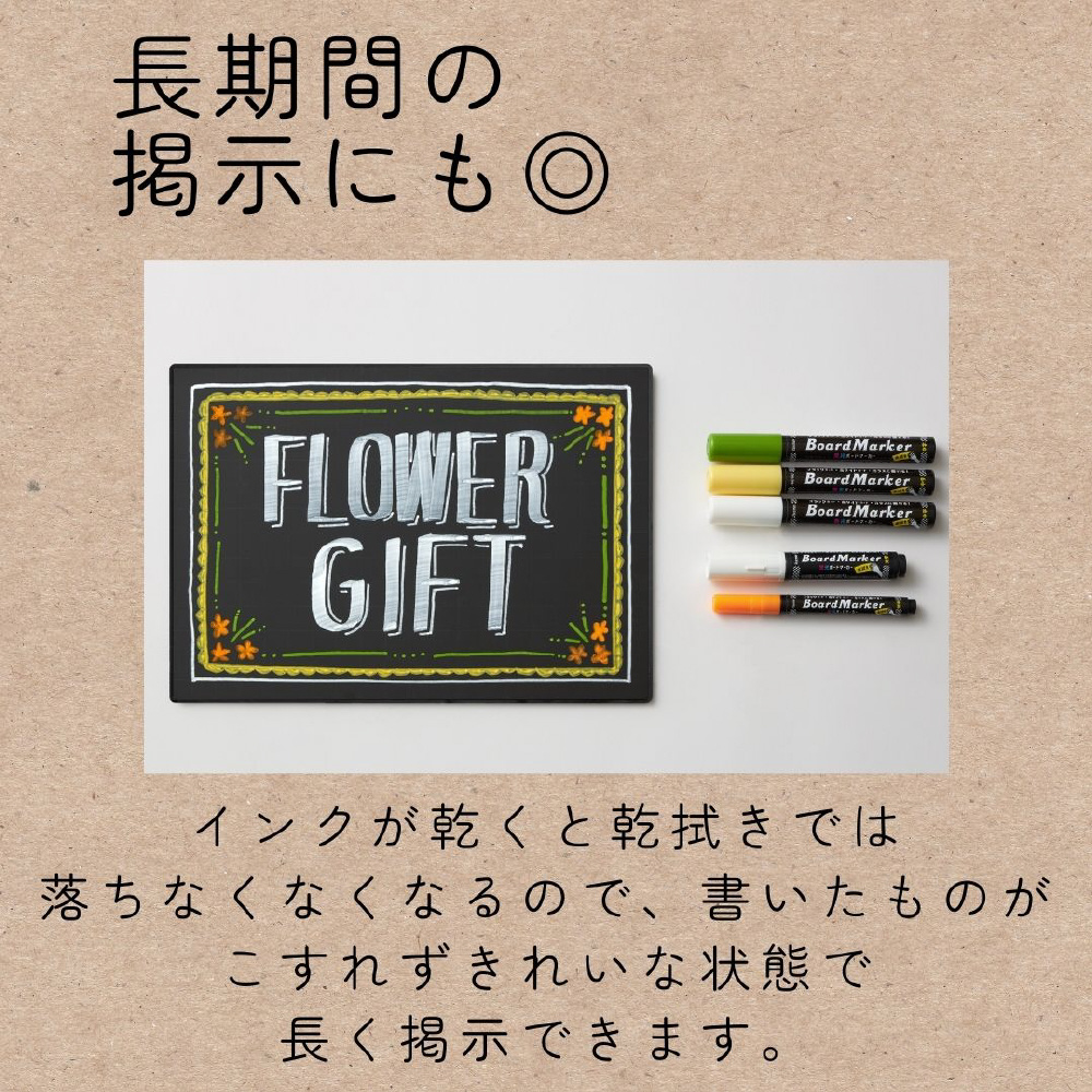 乾くと乾拭きでは落ちなくなるので、書いたものがこすれすぎずきれいな状態で長く掲示できます。