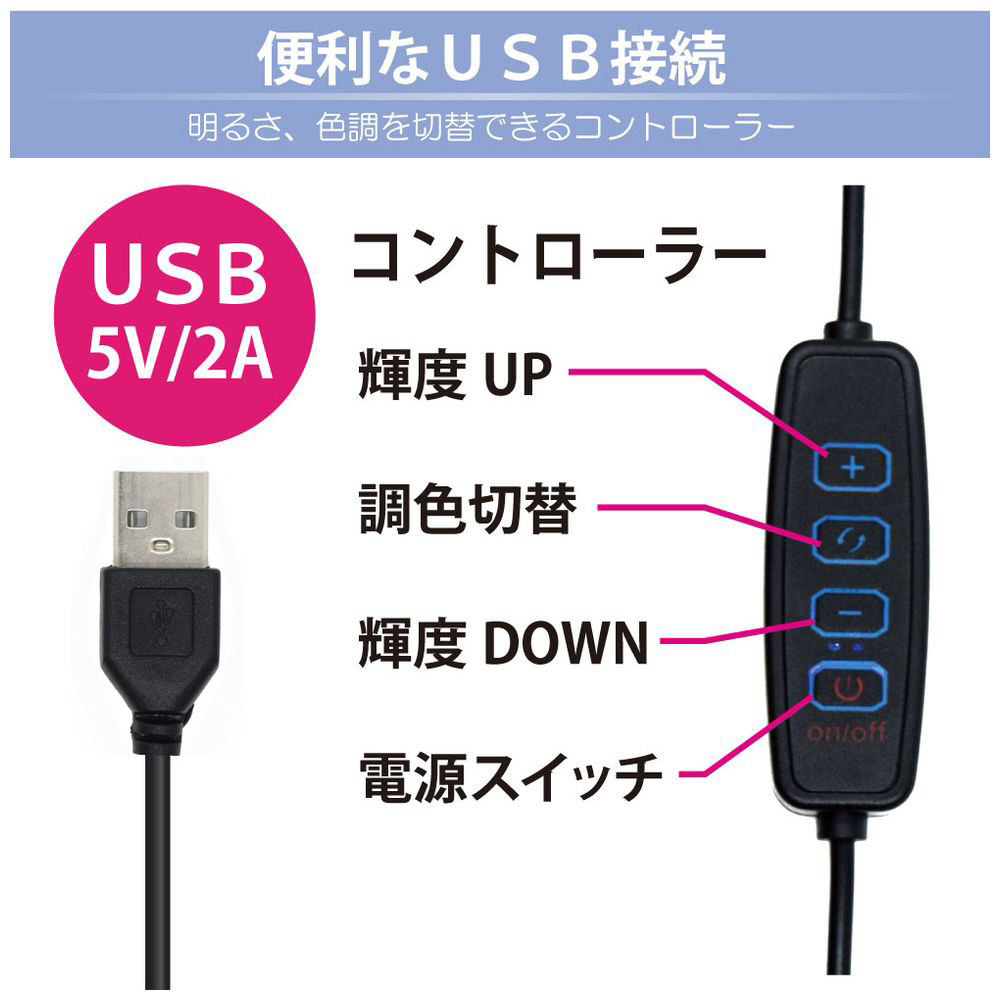 調色機能(3種類)と明るさ調節(10段階)ができるので、 被写体や撮影用環境に合わせて必要な明るさを簡単に調節できます。