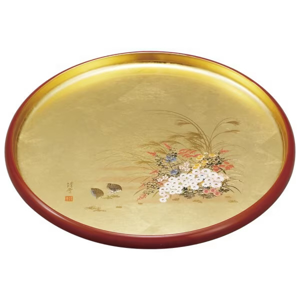 秋草をモチーフにした、菊、桔梗、女郎花など様々な花々が鮮やかな色彩で描かれた丸盆です。