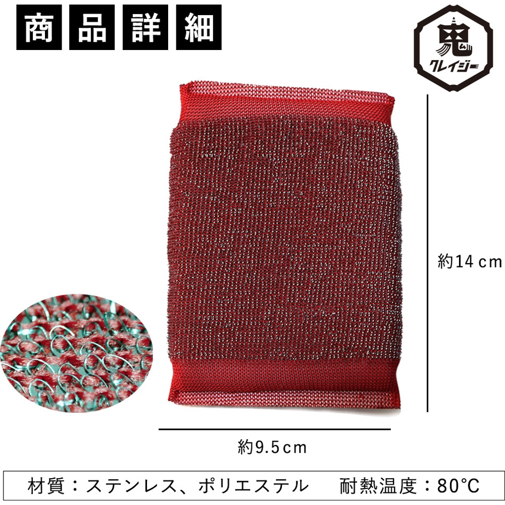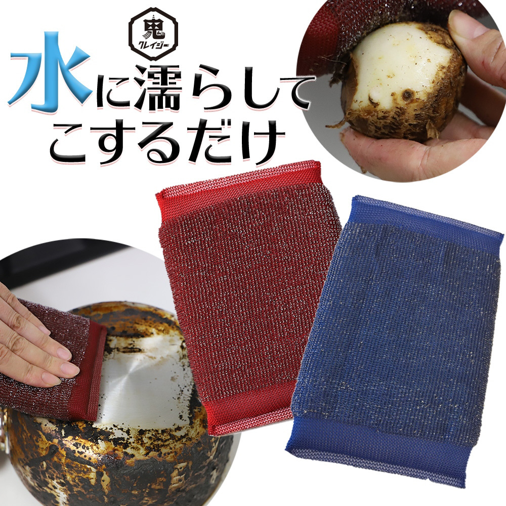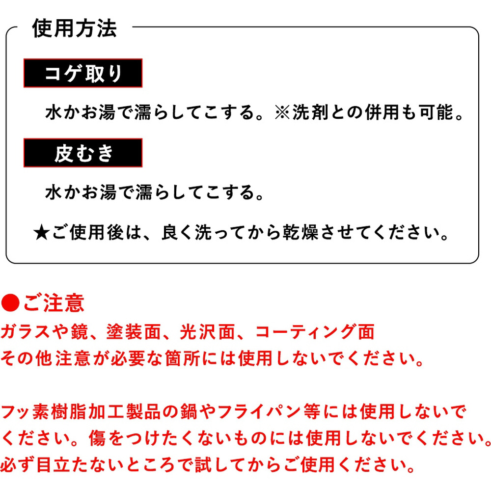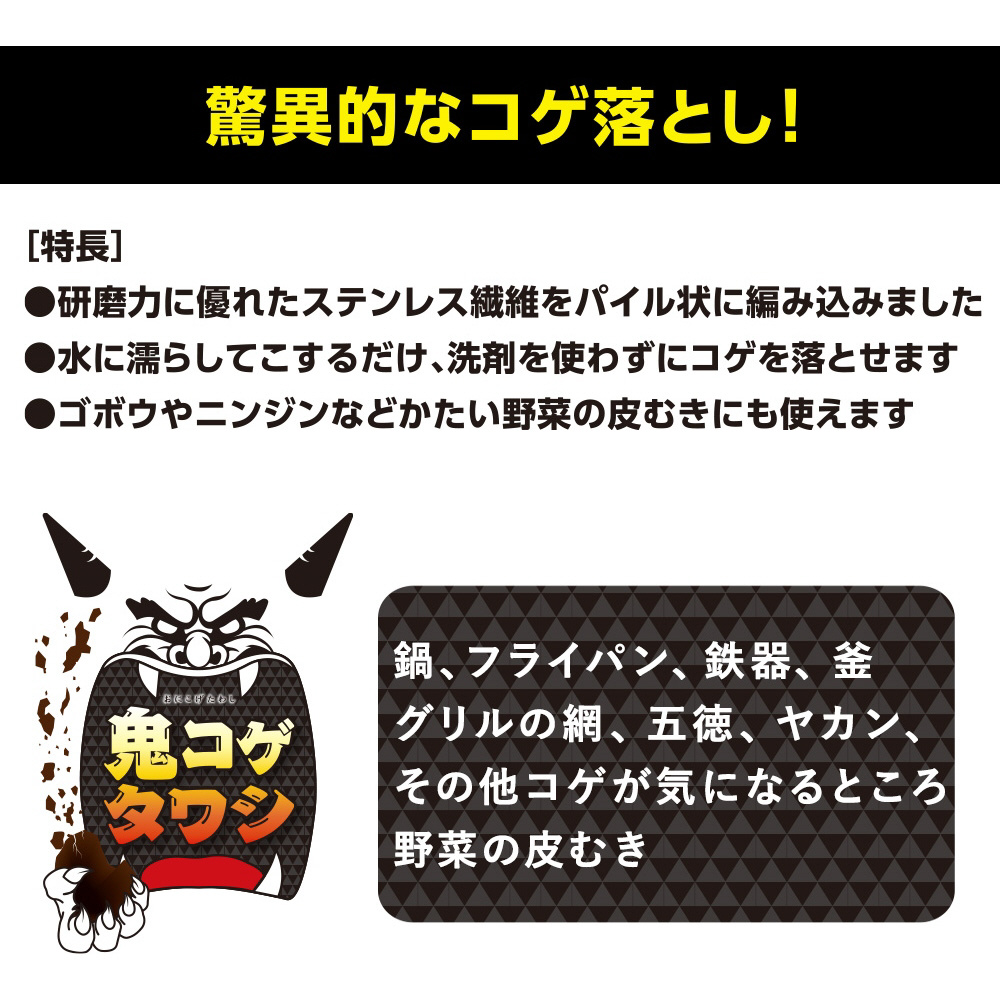 驚異的なコゲ落とし!●研磨力に優れたステンレス繊維をパイル上に編み込みました●水にぬらしてこするだけ、洗剤を使わずにコゲを落とせます●ゴボウやニンジンなどかたい野菜の皮むきにも使えます