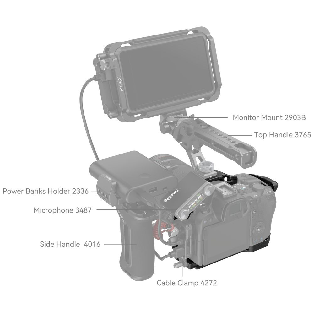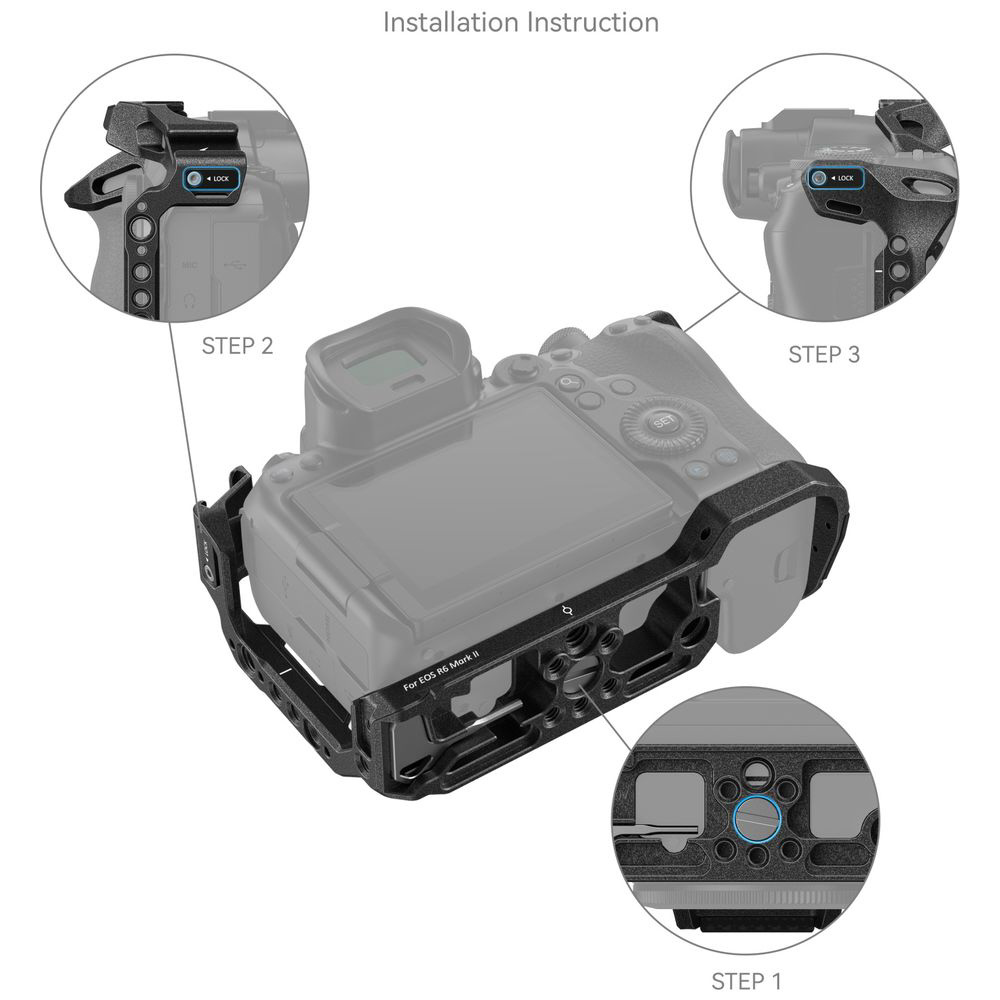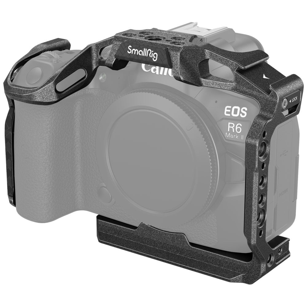 SmallRig “Black Mamba” Canon EOS R6 Mark II用カメラケージ 4161 はカメラを保護し、アクセサリーを取り付けるために設計されています。 Canon EOS R6 Mark IIを1つの底面1/4-20ネジと2つの側面ロックアダプターでロックし、ラバーパッドが傷を防ぎます。「ブラックマンバ」デザインを特徴とするこのケージは、すべてのカメラボタンにフルアクセスでき、複数のアクセサリー取り付けオプションがあります。これらのうち、ARRI 3/8-16の位置決め穴はトップハンドル3765 / 2165Cとモニターマウント2903Bをサポートし、1/4-20のネジ穴はサイドハンドル4016に適合し、内蔵のコールドシューマウントはマイク、LEDビデオライトを保持し、ショルダー&リストストラップ穴はハンドストラップ3848またはショルダーストラップPSC2428に対応します。底部には、DJI RS 2 / RSC 2 / RS 3 / RS 3 Proジンバルまたはアルカタイプ三脚用の一体型アルカスイスクイックリリースプレートがあり、ハンドヘルド、ジンバル、三脚モードを素早く切り替えられるほか、クイックリリースショルダーストラップバックル用のQDマウントもあります。また、組み立てや分解が簡単にできる両端ドライバーも付属しています。
