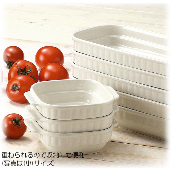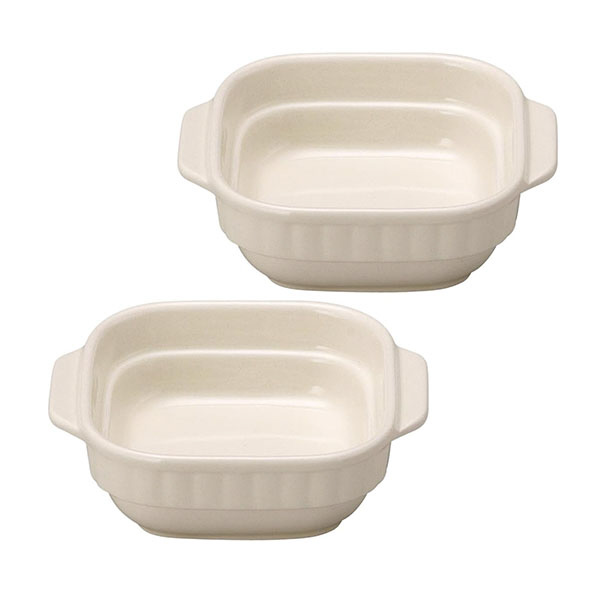 四日市萬古焼の小さなグラタン皿。オーブン対応(オーブントースターも対応)の耐熱陶器製。シンプルなかたち、ベーシックなオフホワイトの2個セット。スタッキング(積み重ね)できるので、収納に場所を取りません。