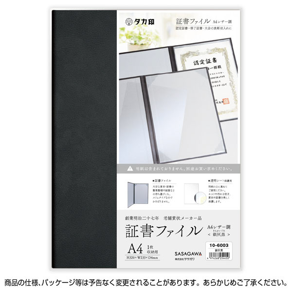 証書ファイル A4 レザー調 銀灰黒 10-6003