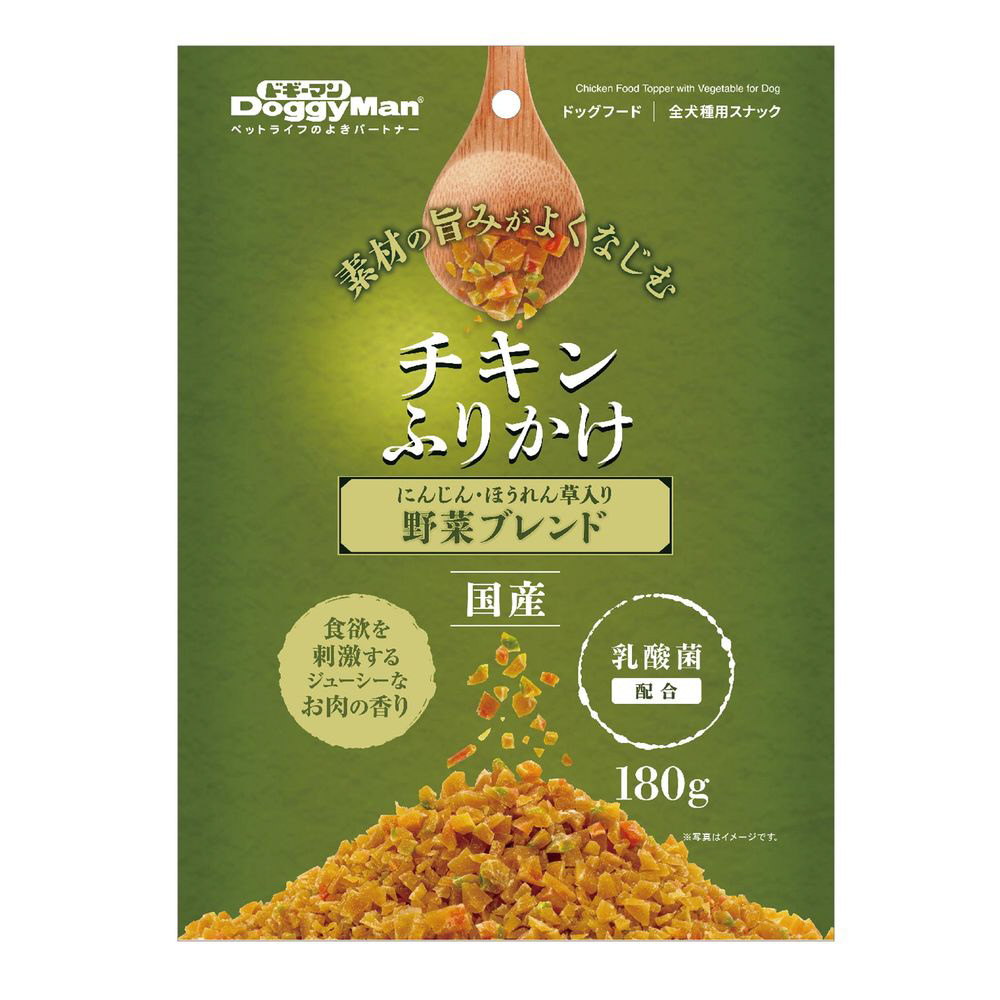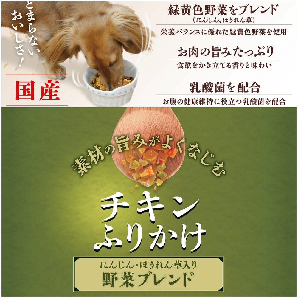 素材の旨みがよくなじむ。にんじん・ほうれん草入り野菜ブレンド。食欲を刺激するジューシーなお肉の香り。乳酸菌配合。