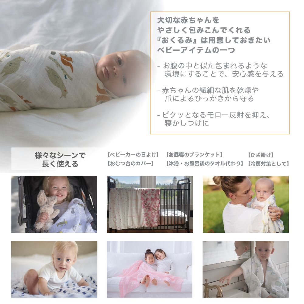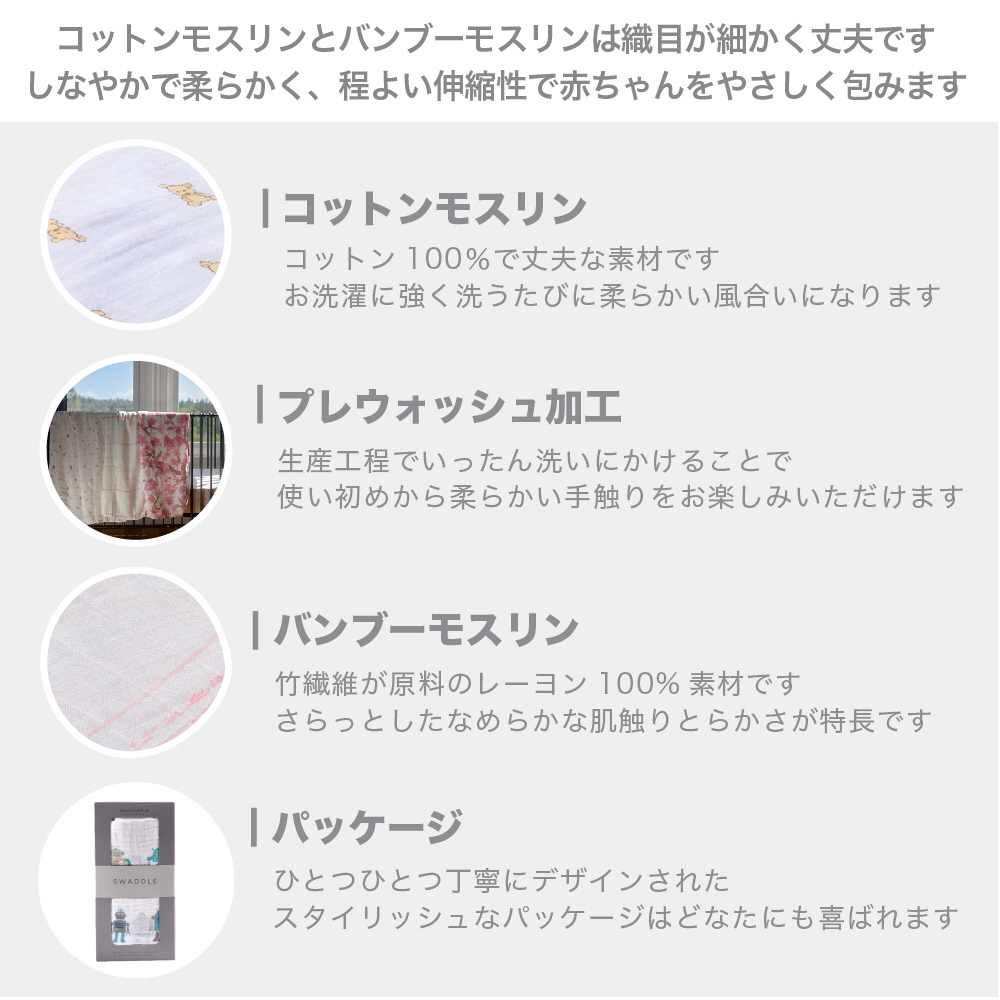 通気性の高いモスリン織素材はさらりと肌触りがよく、体温調節が苦手な赤ちゃんでもいつも気持ちよく過ごせます。