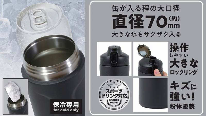 缶が入るほどの大口径!直径約70mmの広口で大きな氷もザクザク入るダイレクトボトル!口径が約70mmあるので、70mm以内の缶がそのまま入ります。アウトドアやスポーツ観戦でも保冷しながら飲めて便利です。大きな氷もそのまま入る!手を入れて洗えるのでお手入れも簡単です。胴部に凹凸があるので持ちやすく、操作しやすい大きめサイズのロックリングです。シンプルなブラックデザインで、粉体塗装を施しているので傷にも強いです。