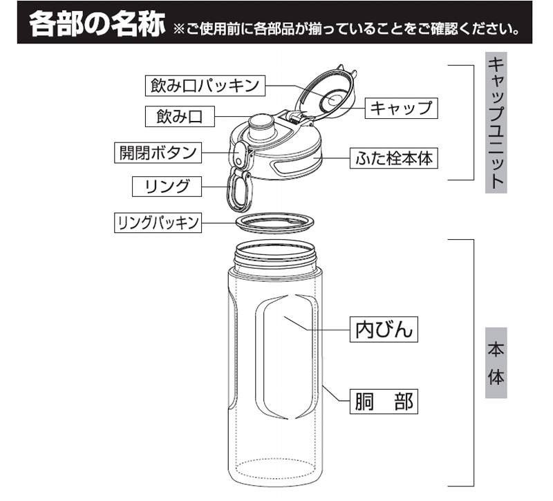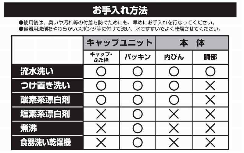 仕様1 材質:内びん=ステンレス鋼 胴部=ステンレス鋼(ポリエステル粉体塗装) ふた栓・キャップ=ポリプロピレン(耐熱温度100度・耐冷温度-20度) 開閉ボタン・リング=ABS樹脂(耐熱温度80度・耐冷温度-20度) パッキン=シリコーンゴム(耐熱温度180度・耐冷温度-20度)