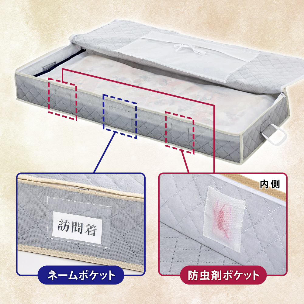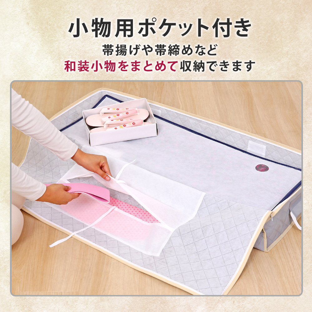 通気性が良く湿気やにおいのこもりにくい不織布製。厚みのあるしっかりとした生地なので丈夫で破れにくい。内側のふた部分に小物収納ポケット付きで和装小物もまとめて保管できる。