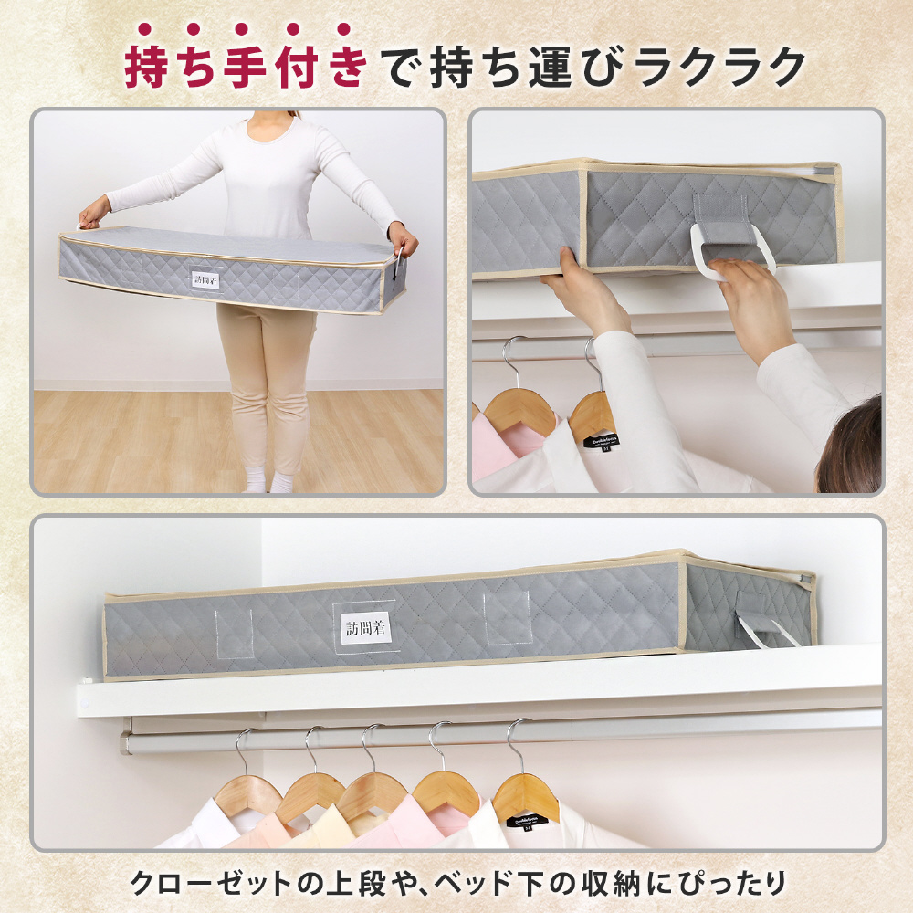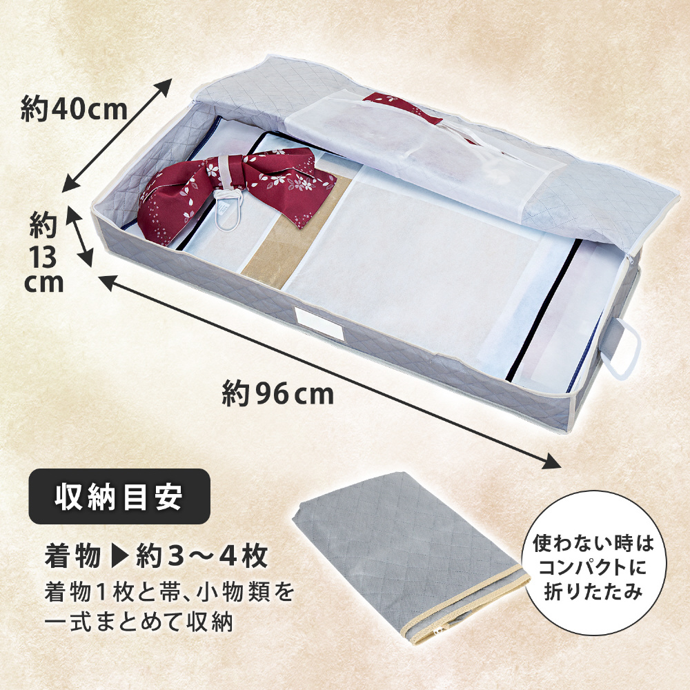 ●サイズ:約幅96×奥行40×高さ13cm ●カラー:グレー、●内容:1個 ●収納目安:たとう紙に入った着物(浴衣)なら約3〜4枚・着物(浴衣)1枚と帯などの和装小物をまとめて収納も可能 ●材質:ポリプロピレン・ポリエステル