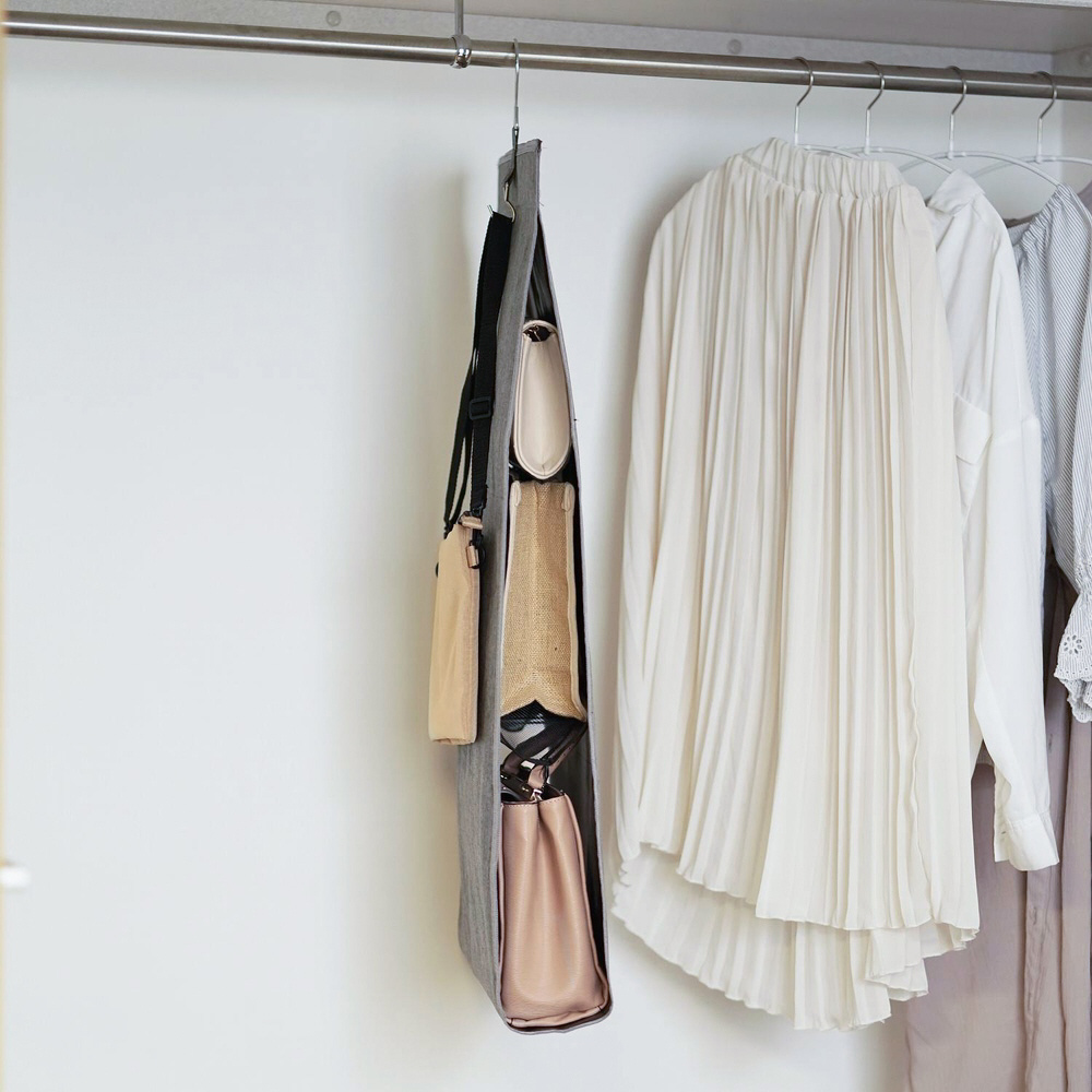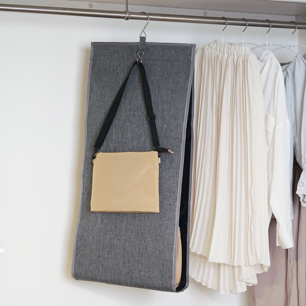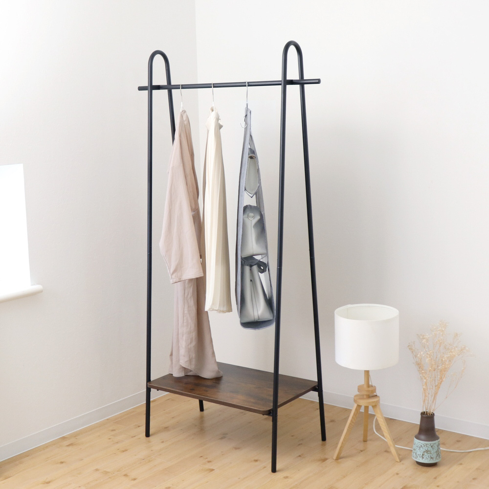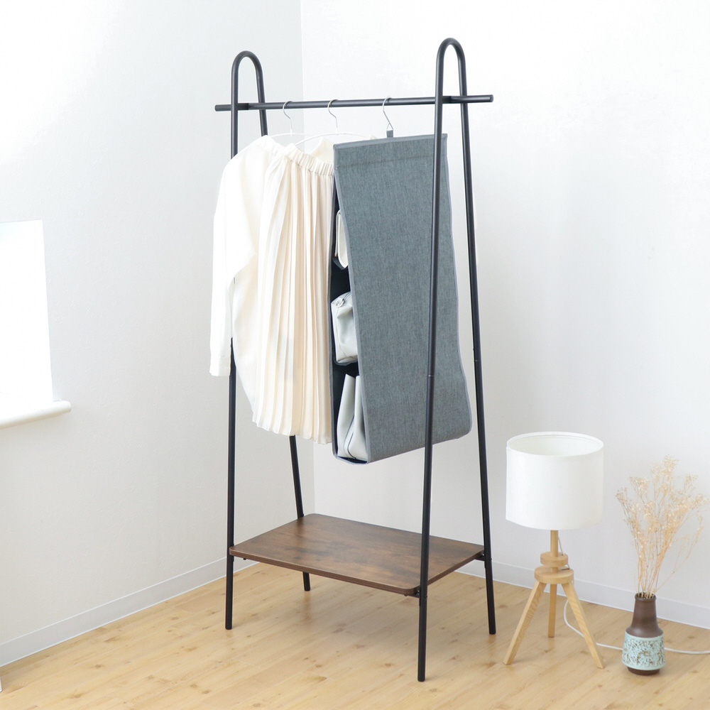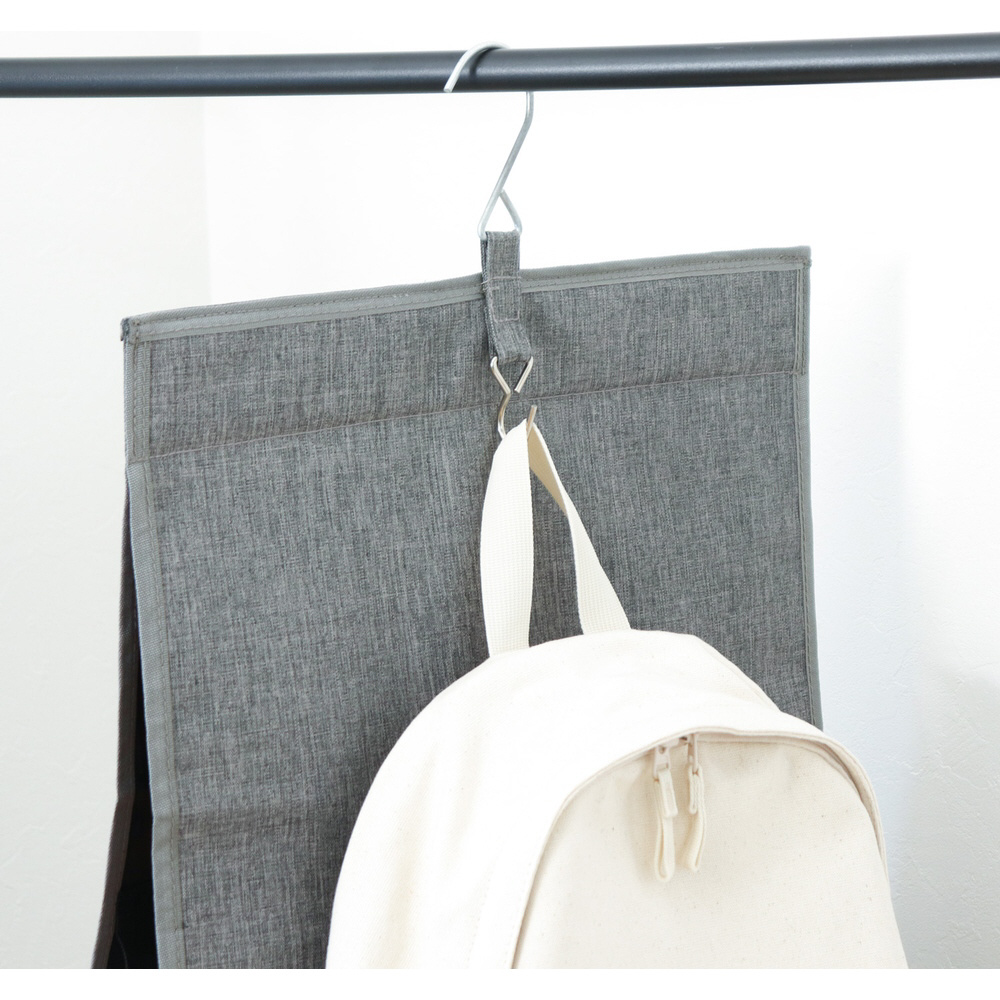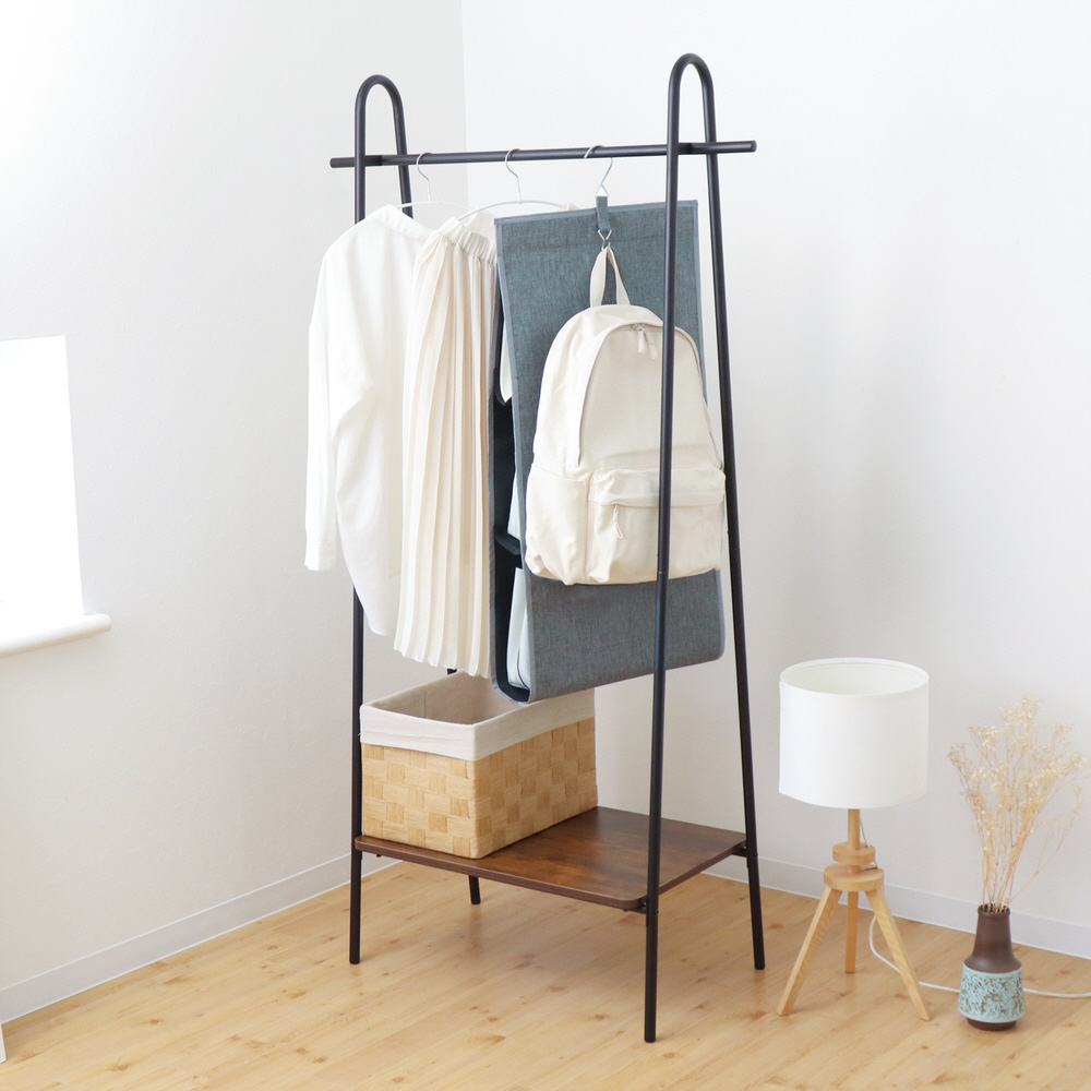 組み合わせてクローゼットやハンガーラックの空間を有効活用できる「かしこい」収納シリーズ。リュック等を掛けられるフック付き。