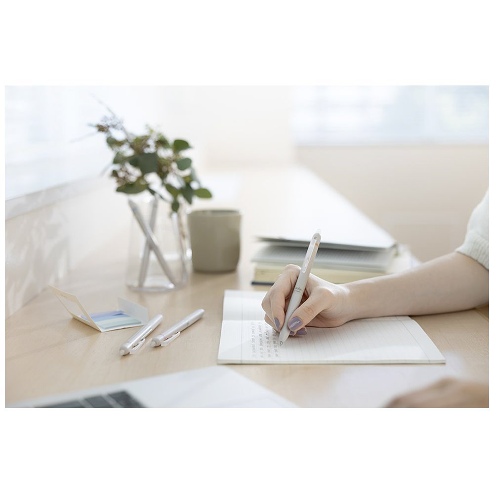 新しいインキ色と丸みのある新形状のシンプルなボディデザインが特長の消せるボールペンです。