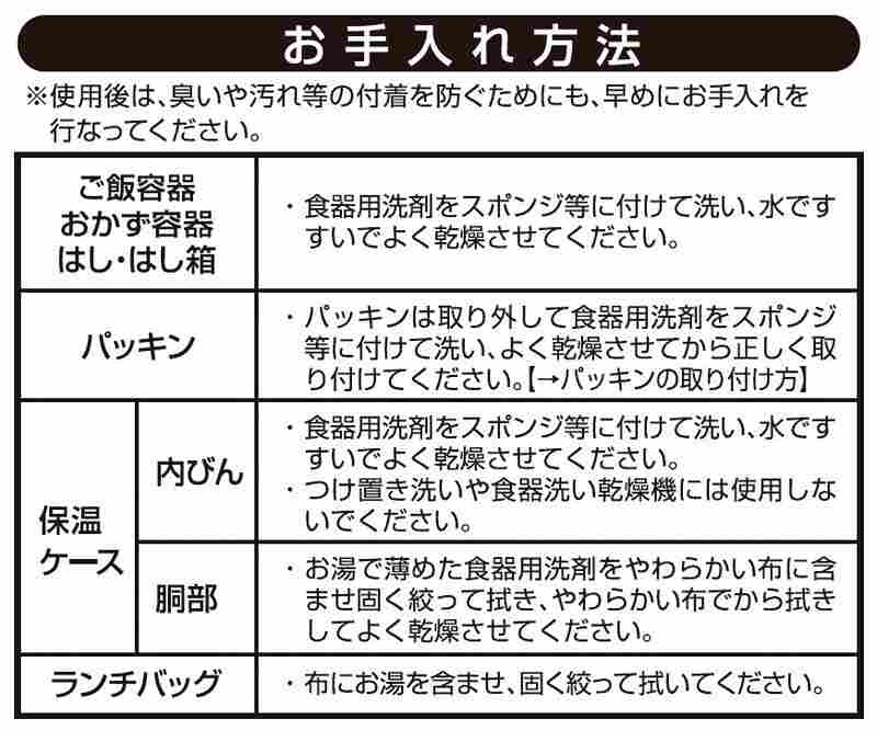 保温ケース・ご飯容器のふたは、つけ置き洗い等の丸洗いはしないでください。