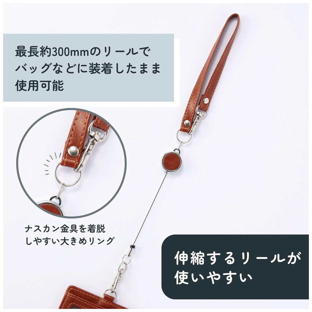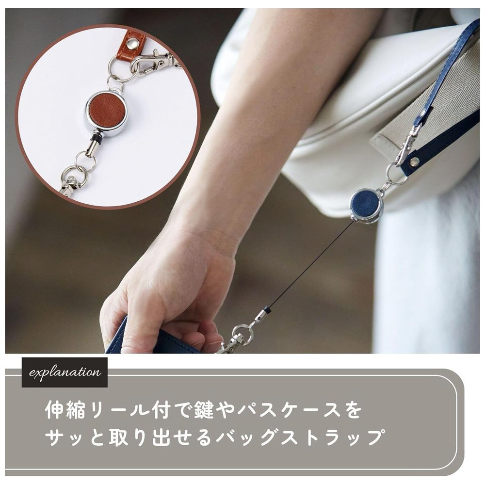 伸縮リール付で鍵やパスケースをサッと取り出せるリール付きバッグストラップ。