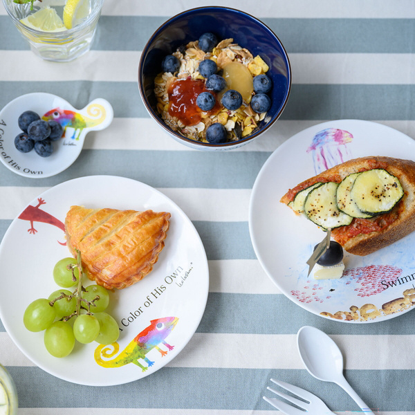 絵本から飛び出した色鮮やかなキャラクターたちのプレート。トーストしたパンやパンケーキをのせて、朝食メニューにもぴったり。