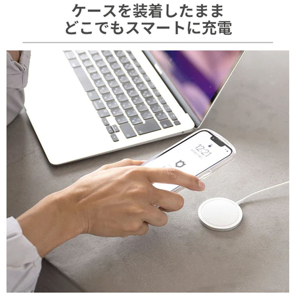 ケース背面モジュール部分に磁気が内蔵されていて、ケーブル充電よりも簡単でスマートに充電が可能。MagSafe対応充電器やアクセサリーなどが磁力でくっつき、ずれにくい。