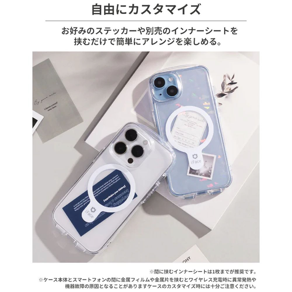 ●ケース本体とスマートフォンの間に金属フィルムや金属片を挟むとワイヤレス充電時に異常発熱や機器故障の原因となることがあります。ケースのカスタマイズ時には十分ご注意ください。