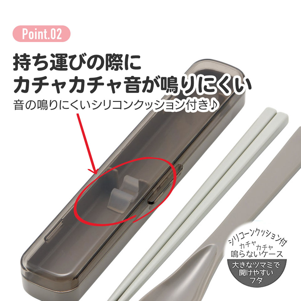 SIAA抗菌加工。Ag+ 銀イオンで抗菌。細菌の増殖を抑制します。シリコンクッションが付いているので、持ち運びの際にカチャカチャ音が鳴らない!箸とスプーンのセット!重ねて収納コンパクト!食洗機対応です。※すべての細菌の増殖を抑制するものではありません。