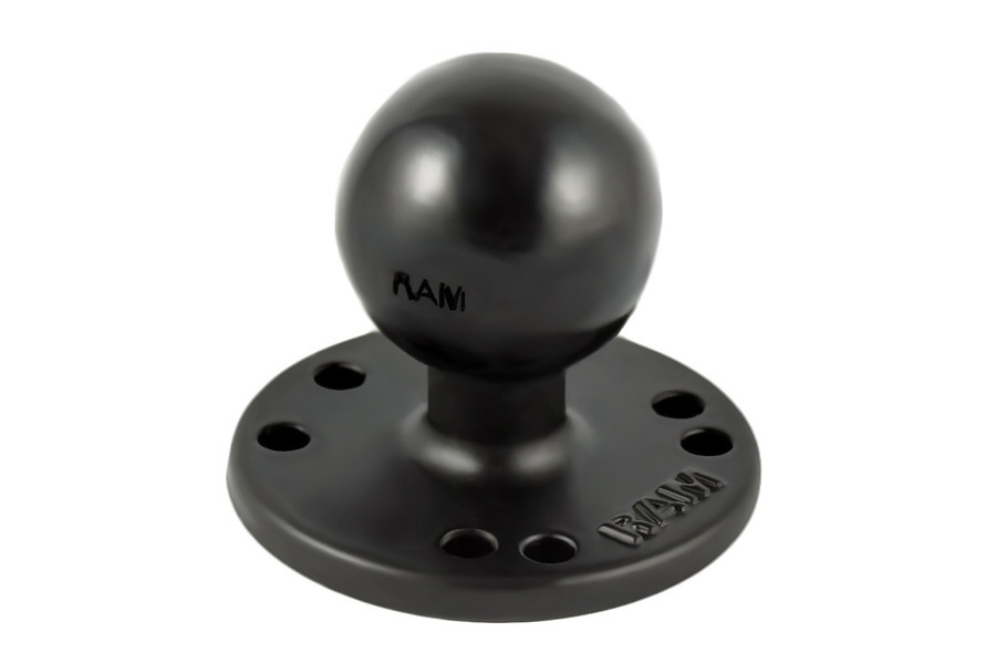 直径63.5mmのラウンドプレートに7つの穴が設けられ、その内4穴で構成されるAMPSホールパターンは、4点の穴の中心がそれぞれ38x30mm、対角線上の2穴が48.5mmの間隔で空けられた汎用性のいホールパターンで、ラムマウントのタブレットホルダーなどに広く対応します。ボールジョイントを取り付けることで、対応するボールサイズの他ラムマウントパーツと組み合わせて好きな箇所へ自由自在にマウントを構築することが可能になります。