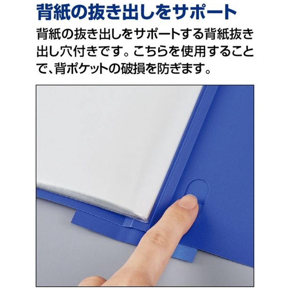 ■背ポケットの背紙の抜き出しがしやすくなる背紙抜き差し穴付きです。