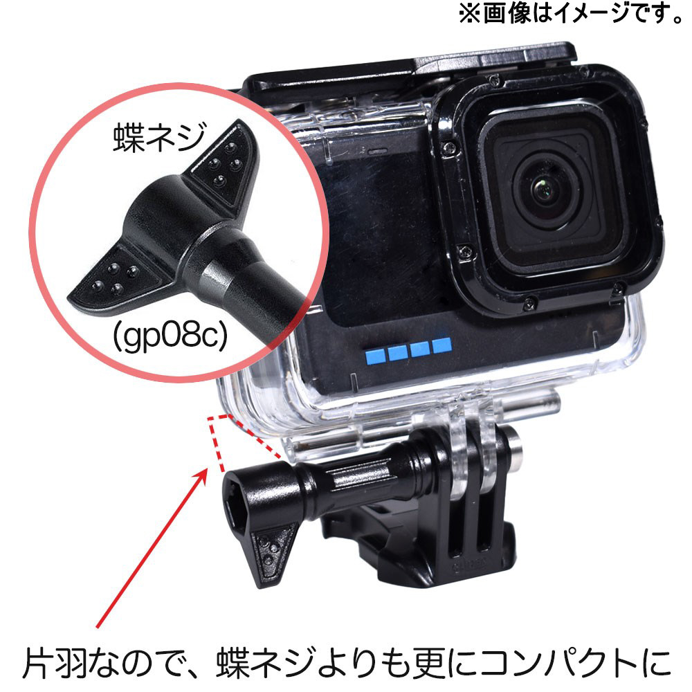 羽がついているため、通常のGoPro用ネジよりも力を入れやすく、レンチスパナを使用せずにしっかりと固定できます。