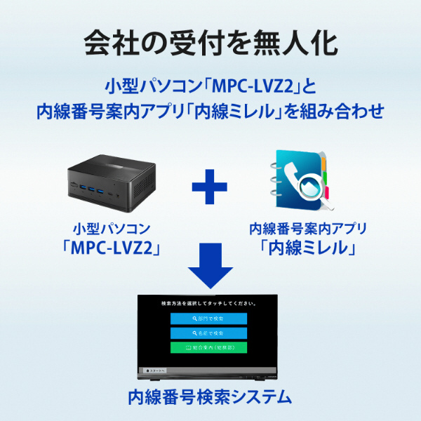 アイ・オー・データ機器製小型パソコン「MPC-LVZ2」とオリジナルの内線番号案内アプリ「内線ミレル」を組み合わせることで、会社の受付を無人化することができます。