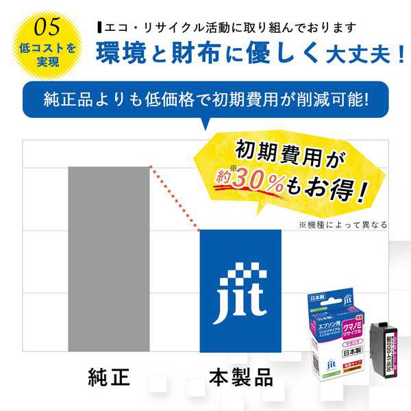 プリンタインクはジットのリサイクルインクがおすすめ!なぜなら・・・3つの嬉しいメリット!(1)ISO9001を取得している工場で生産しているから【高品質】(2)純正品カートリッジを再利用することにより【低価格】(3)購入後サポートや、プリンタ保証もあって【安心】低価格と高品質を両立!さらに、保証を付けたのがジットのリサイクルインクです!