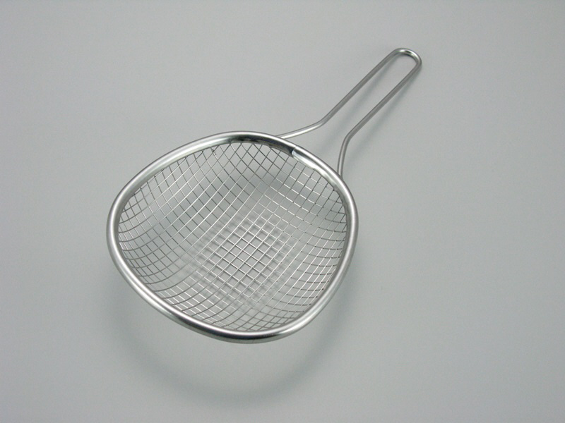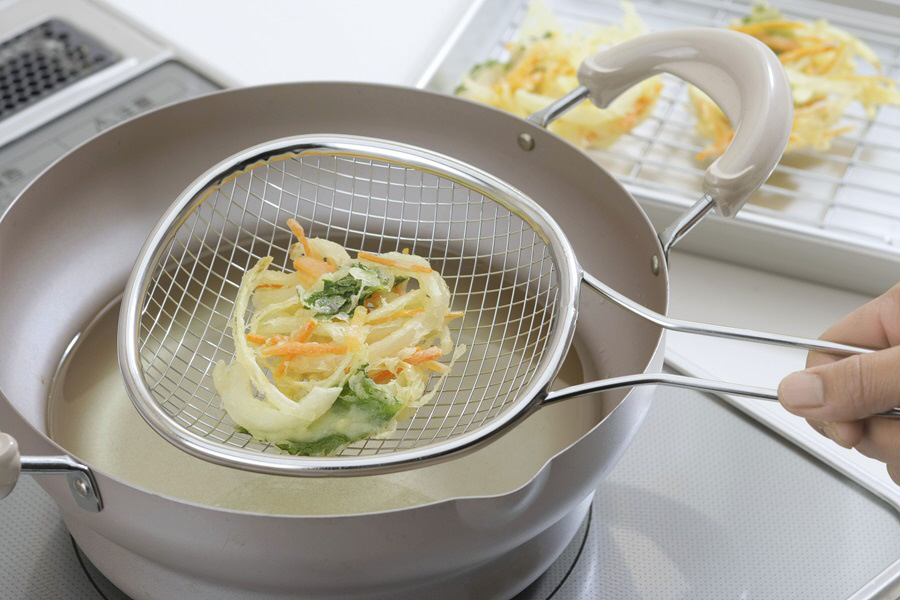 目の大きな特殊網を使用することで油切りが簡単にできます。このメッシュアミは通常のザルメッシュアミと違い編んでいません。溶接アミといわれるもので、線と線との接点が少なく、油汚れが付きにくくお手入れかんたんです。